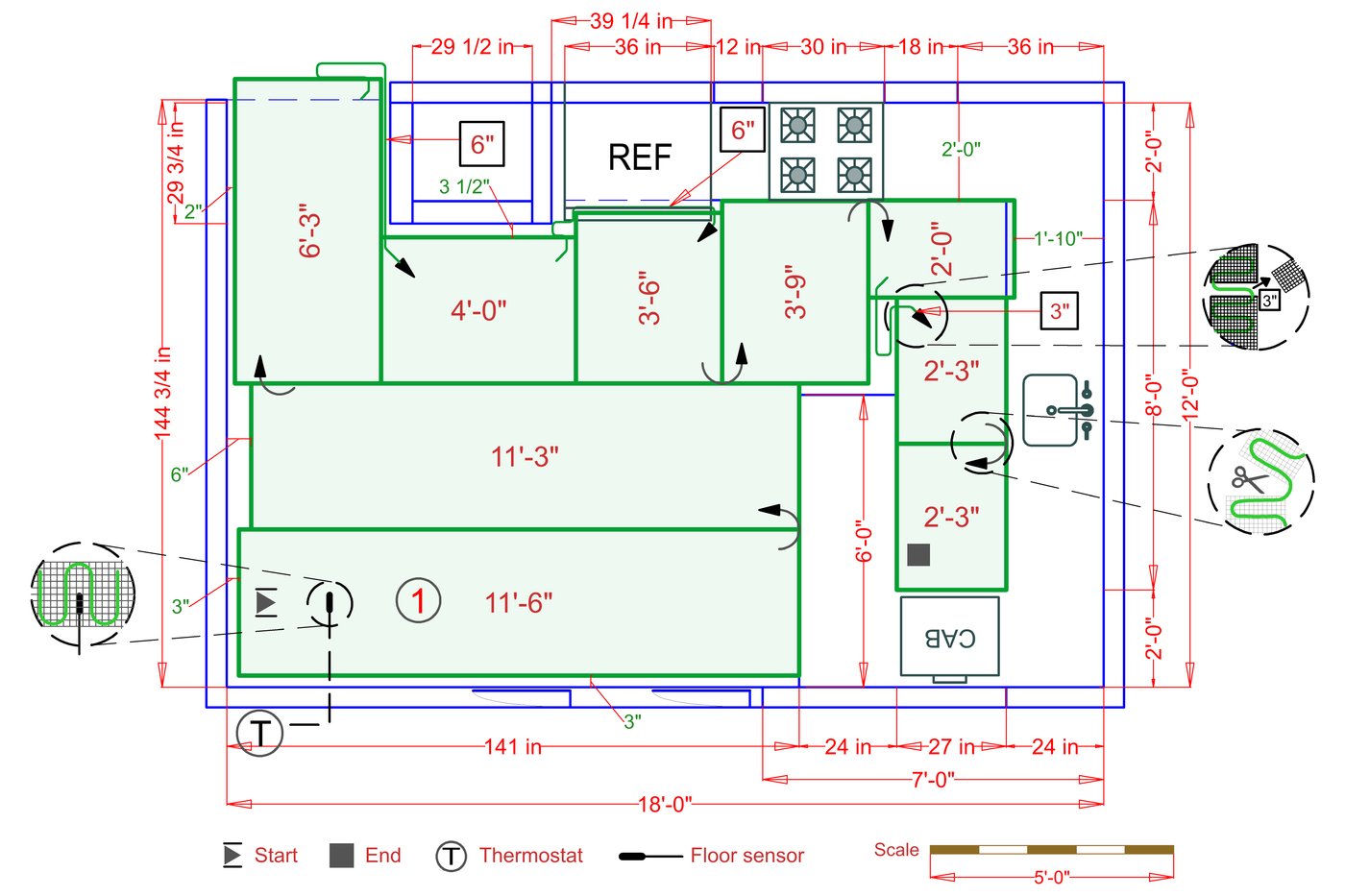 WarmlyYours offers a heating system for all of the most common flooring surfaces, including tile, stone, and marble. Each system type has unique advantages and best applications. Below you will find several different floor plans that are based on this example kitchen. Each breakdown is based on a different heating element and each breakdown will provide product information and costs. If you have any questions about which system type would be best for your project, you can contact us directly.Click on any of these available installation options below to see an example floor plan and project breakdown: