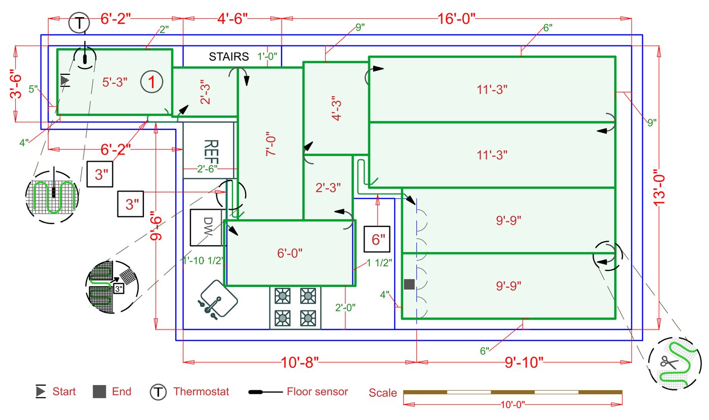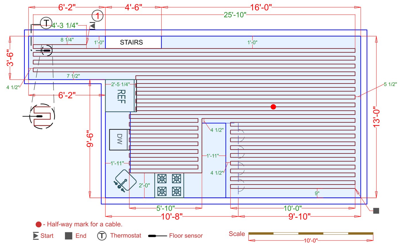 WarmlyYours offers a heating system for all of the most common flooring surfaces, including tile, stone, and marble. Each system type has unique advantages and best applications. Below you will find several different floor plans that are based on this example kitchen. Each breakdown is based on a different heating element and each breakdown will provide product information and costs. If you have any questions about which system type would be best for your project, you can contact us directly.Click on any of these available installation options below to see an example floor plan and project breakdown: