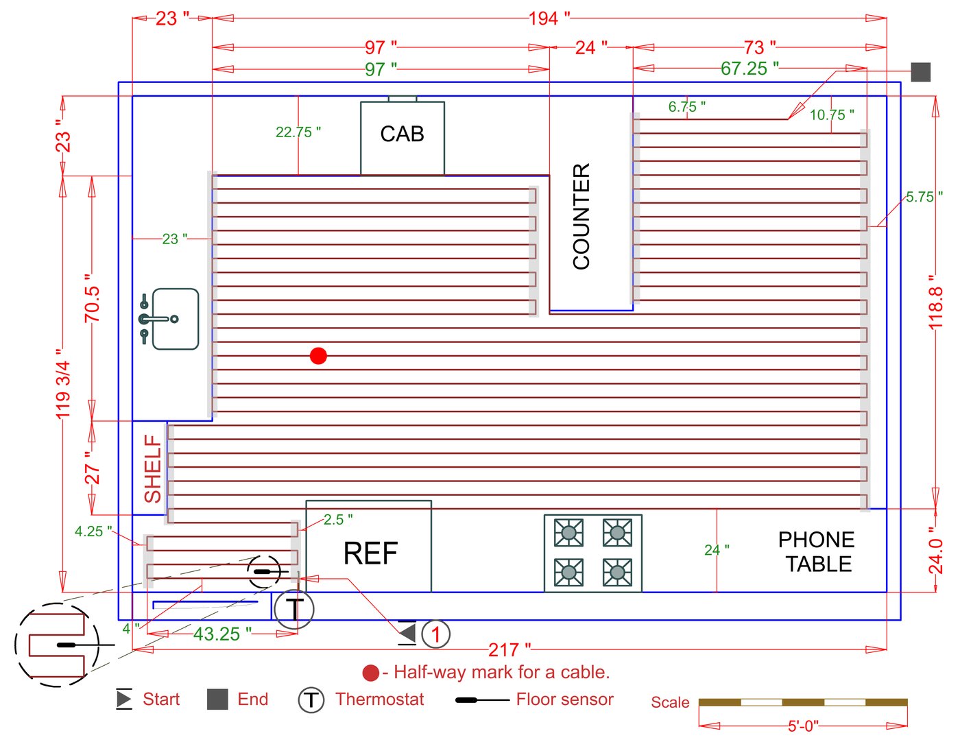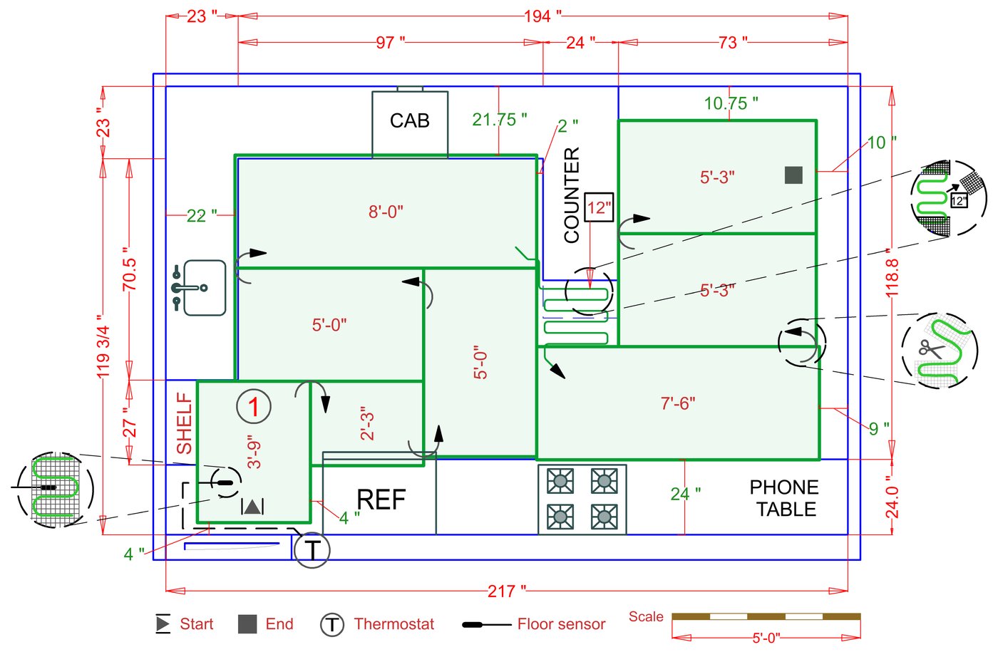 WarmlyYours offers a heating system for all of the most common flooring surfaces, including tile, stone, and marble. Each system type has unique advantages and best applications. Below you will find several different floor plans that are based on this example kitchen. Each breakdown is based on a different heating element and each breakdown will provide product information and costs. If you have any questions about which system type would be best for your project, you can contact us directly.Click on any of these available installation options below to see an example floor plan and project breakdown: