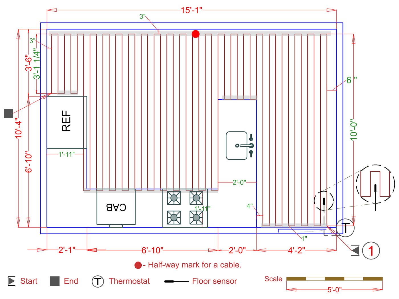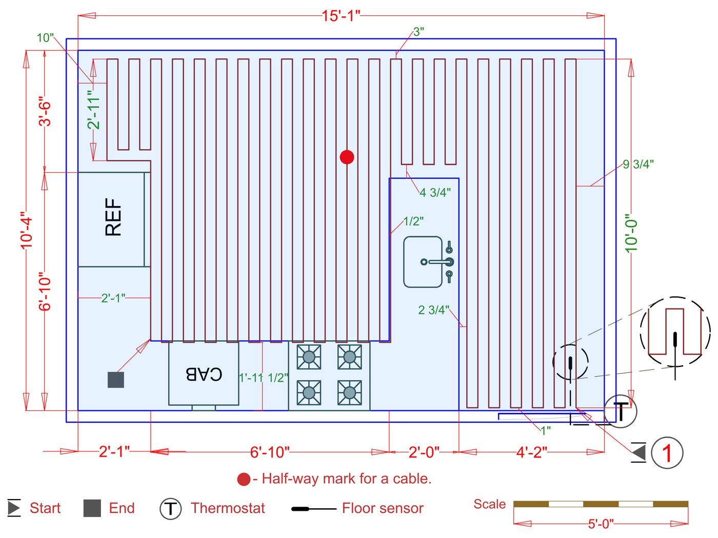 WarmlyYours offers a heating system for all of the most common flooring surfaces, including tile, stone, and marble. Each system type has unique advantages and best applications. Below you will find several different floor plans that are based on this example kitchen. Each breakdown is based on a different heating element and each breakdown will provide product information and costs. If you have any questions about which system type would be best for your project, you can contact us directly.Click on any of these available installation options below to see an example floor plan and project breakdown:
