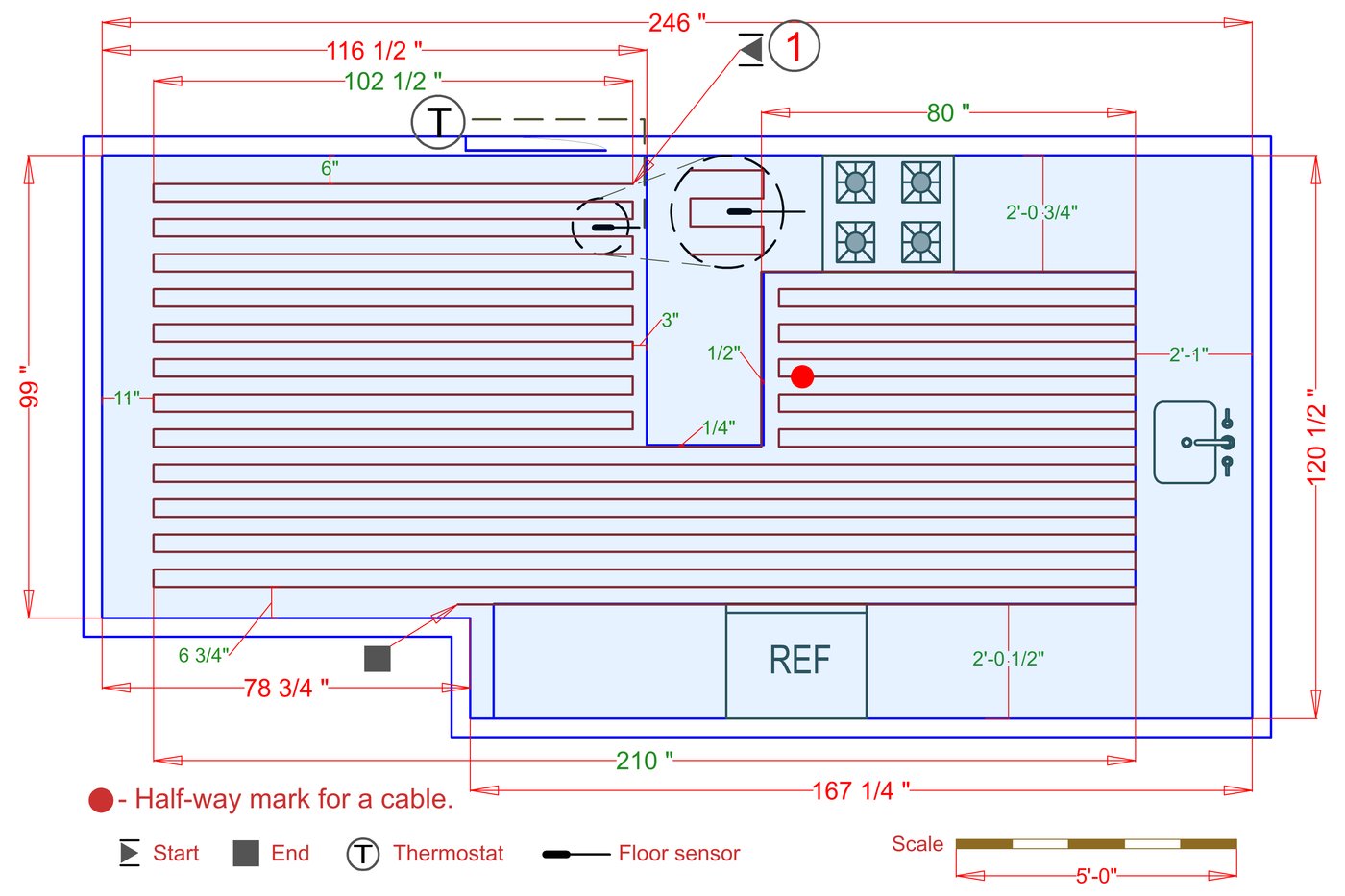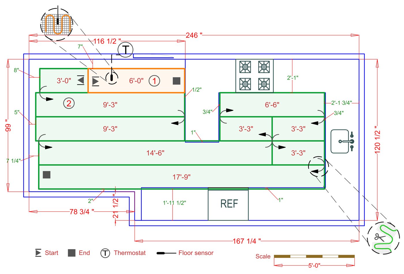 WarmlyYours offers a heating system for all of the most common flooring surfaces, including tile, stone, and marble. Each system type has unique advantages and best applications. Below you will find several different floor plans that are based on this example kitchen. Each breakdown is based on a different heating element and each breakdown will provide product information and costs. If you have any questions about which system type would be best for your project, you can contact us directly.Click on any of these available installation options below to see an example floor plan and project breakdown: