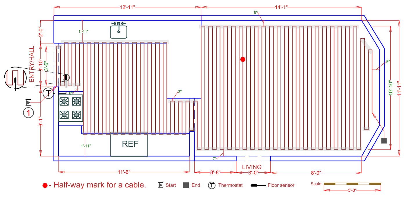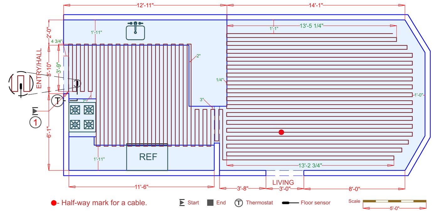 WarmlyYours offers a heating system for all of the most common flooring surfaces, including tile, stone, and marble. Each system type has unique advantages and best applications. Below you will find several different floor plans that are based on this example kitchen. Each breakdown is based on a different heating element and each breakdown will provide product information and costs. If you have any questions about which system type would be best for your project, you can contact us directly.Click on any of these available installation options below to see an example floor plan and project breakdown: