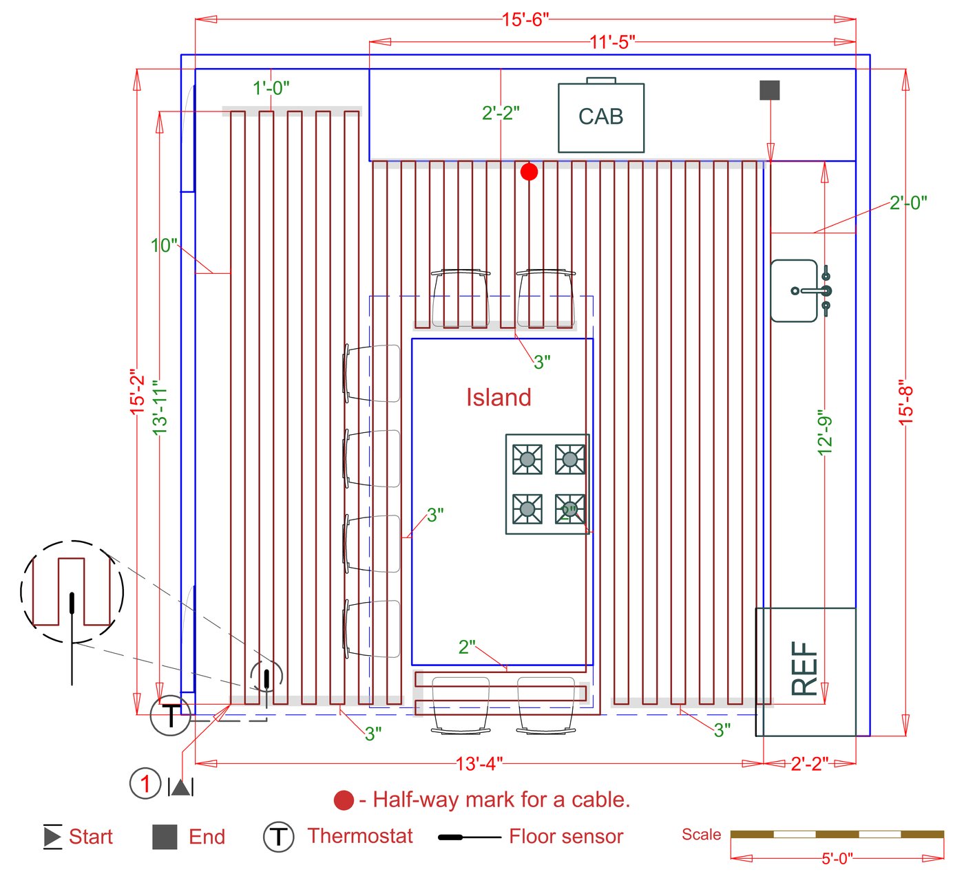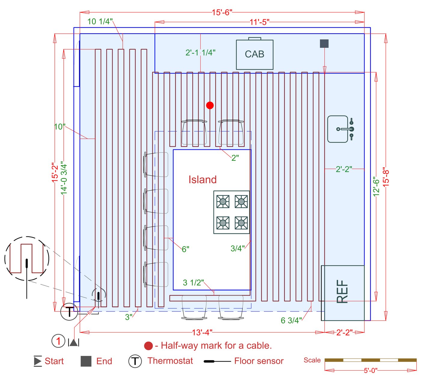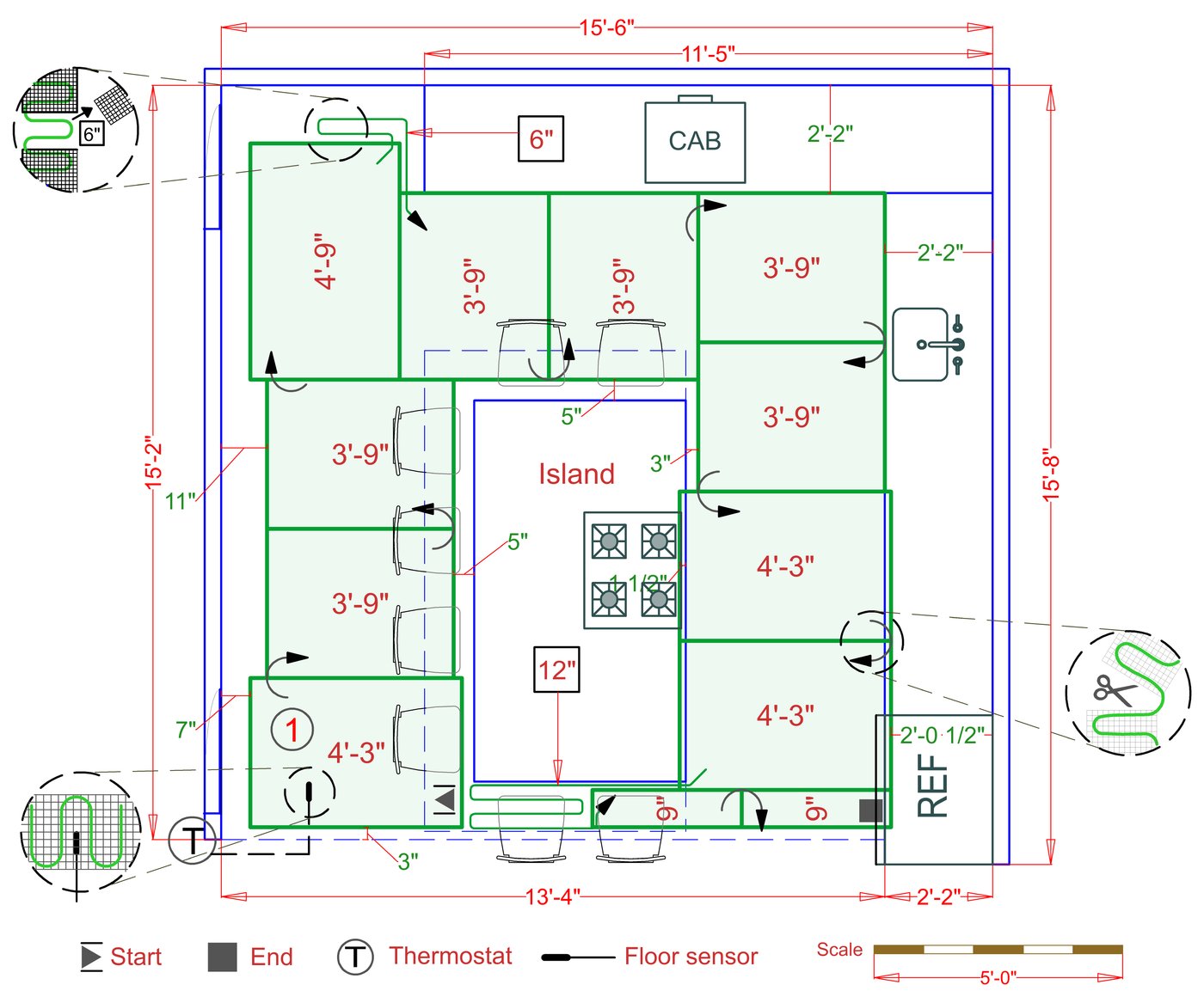 WarmlyYours offers a heating system for all of the most common flooring surfaces, including tile, stone, and marble. Each system type has unique advantages and best applications. Below you will find several different floor plans that are based on this example kitchen. Each breakdown is based on a different heating element and each breakdown will provide product information and costs. If you have any questions about which system type would be best for your project, you can contact us directly.Click on any of these available installation options below to see an example floor plan and project breakdown: