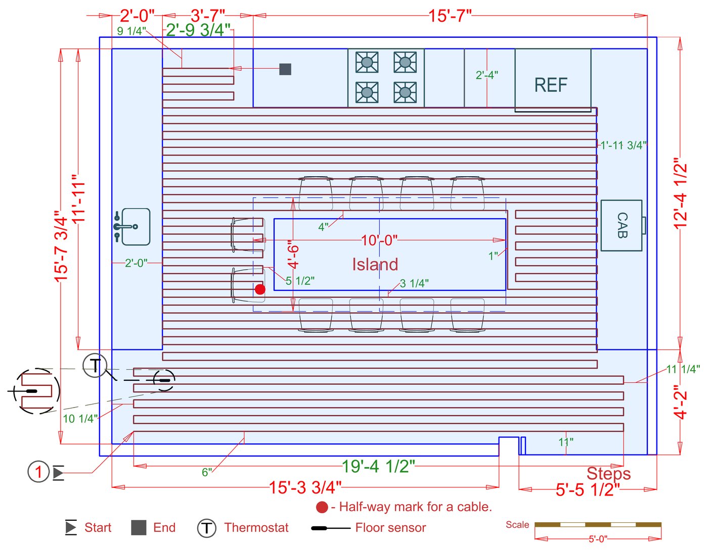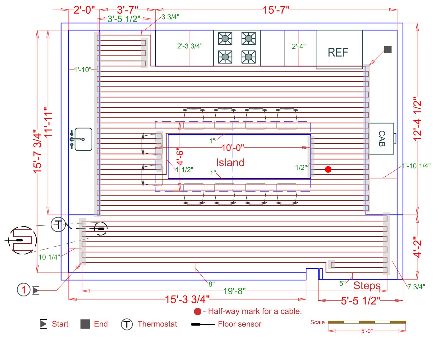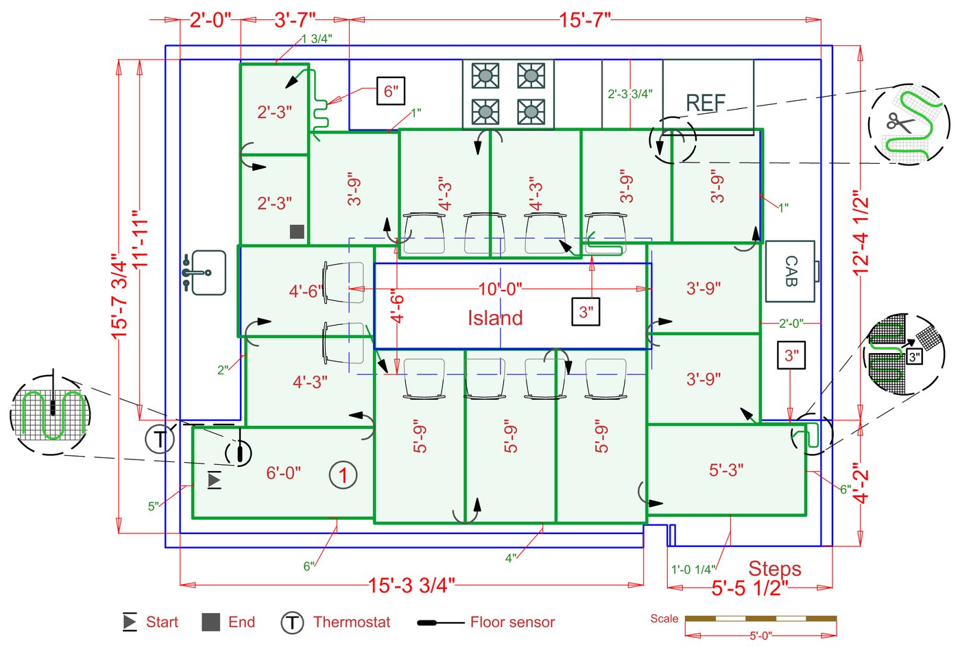 WarmlyYours offers a heating system for all of the most common flooring surfaces, including tile, stone, and marble. Each system type has unique advantages and best applications. Below you will find several different floor plans that are based on this example kitchen. Each breakdown is based on a different heating element and each breakdown will provide product information and costs. If you have any questions about which system type would be best for your project, you can contact us directly.Click on any of these available installation options below to see an example floor plan and project breakdown: