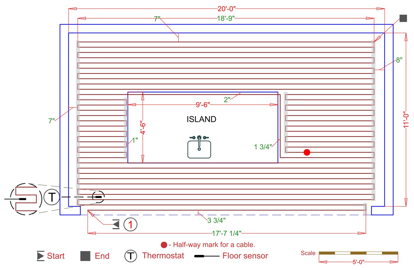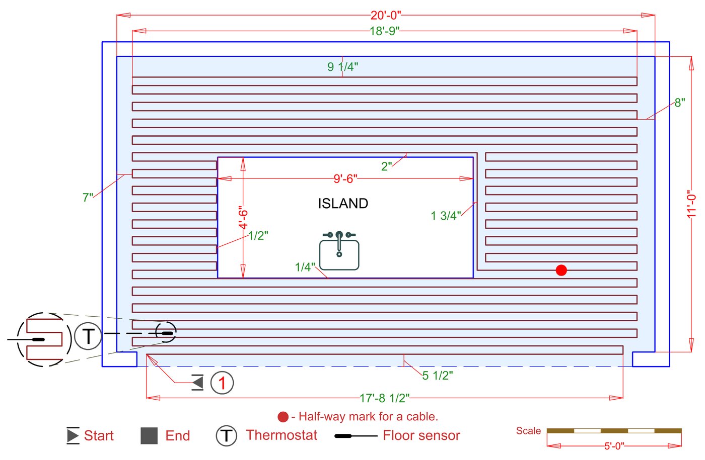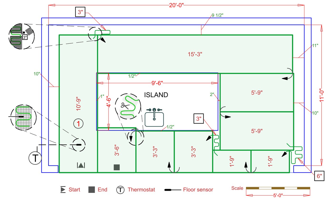 WarmlyYours offers a heating system for all of the most common flooring surfaces, including tile, stone, and marble. Each system type has unique advantages and best applications. Below you will find several different floor plans that are based on this example kitchen. Each breakdown is based on a different heating element and each breakdown will provide product information and costs. If you have any questions about which system type would be best for your project, you can contact us directly.Click on any of these available installation options below to see an example floor plan and project breakdown: