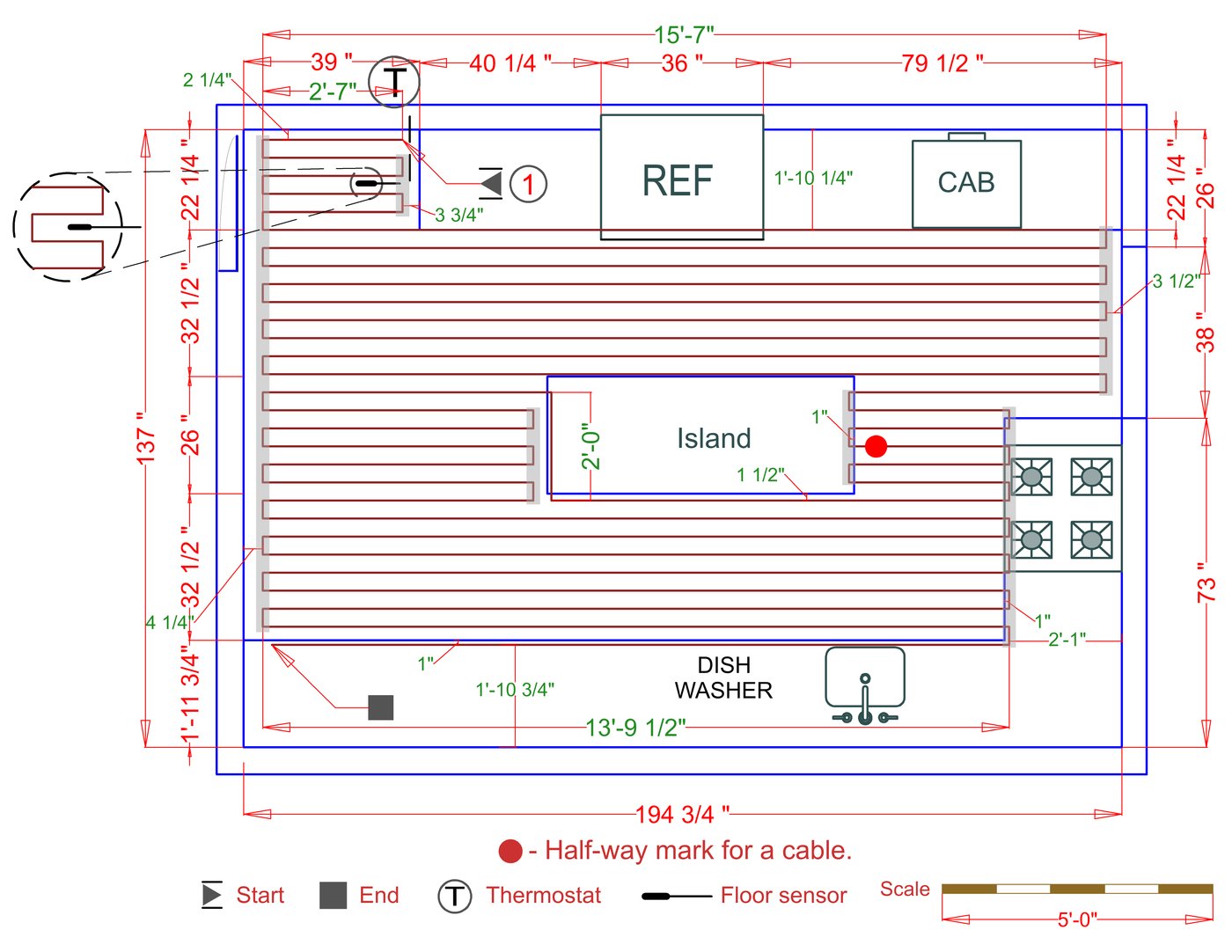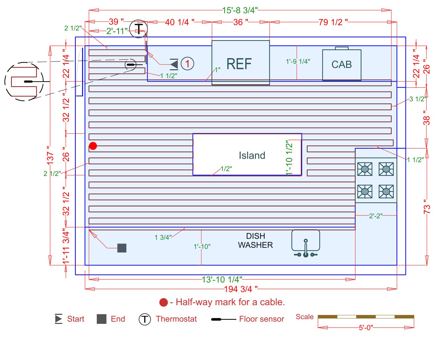 WarmlyYours offers a heating system for all of the most common flooring surfaces, including tile, stone, and marble. Each system type has unique advantages and best applications. Below you will find several different floor plans that are based on this example kitchen. Each breakdown is based on a different heating element and each breakdown will provide product information and costs. If you have any questions about which system type would be best for your project, you can contact us directly.Click on any of these available installation options below to see an example floor plan and project breakdown: