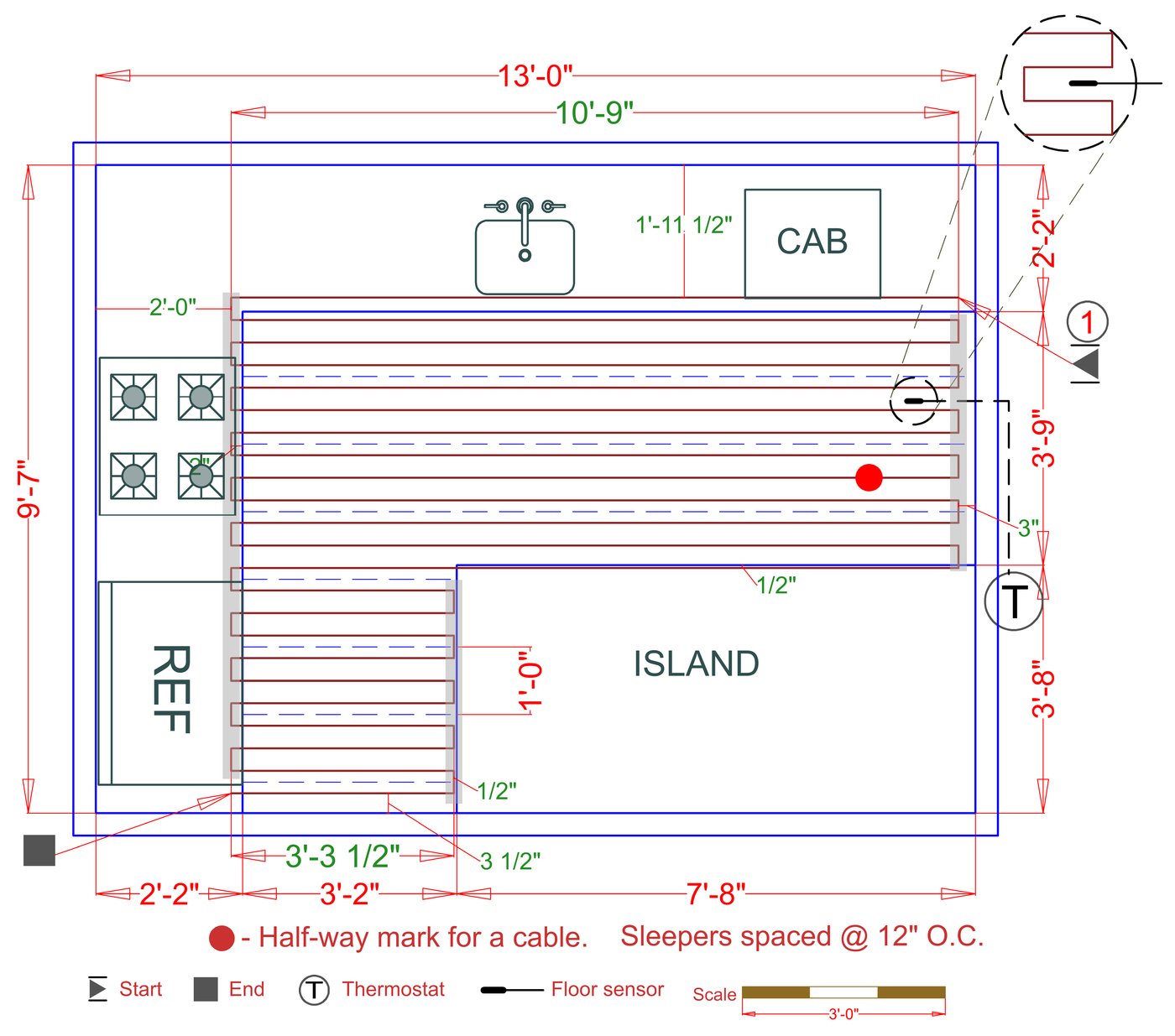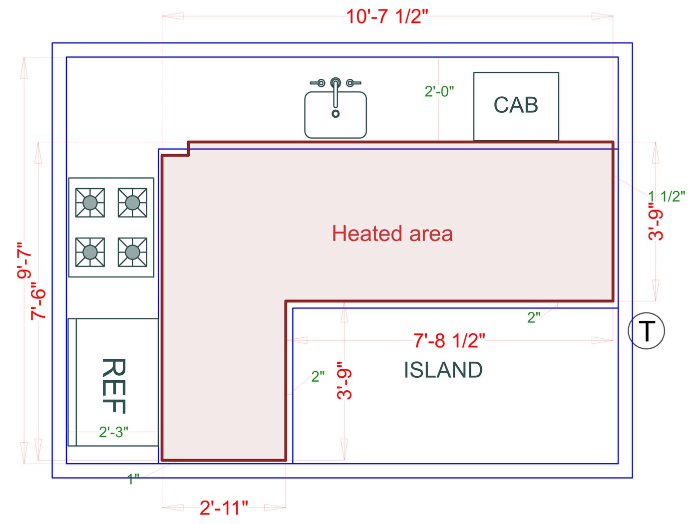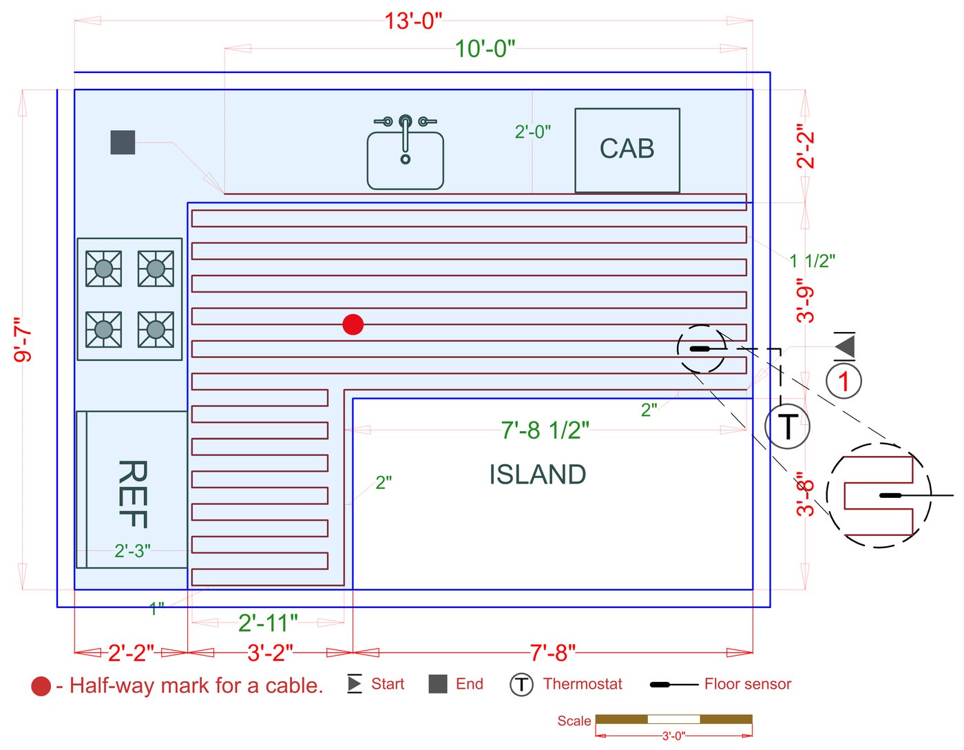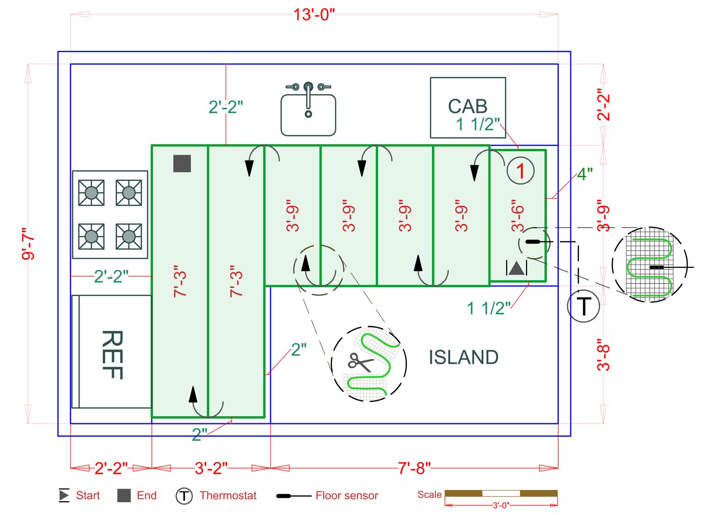WarmlyYours offers a heating system for all of the most common flooring surfaces, including tile, stone, and marble. Each system type has unique advantages and best applications. Below you will find several different floor plans that are based on this example kitchen. Each breakdown is based on a different heating element and each breakdown will provide product information and costs. If you have any questions about which system type would be best for your project, you can contact us directly.