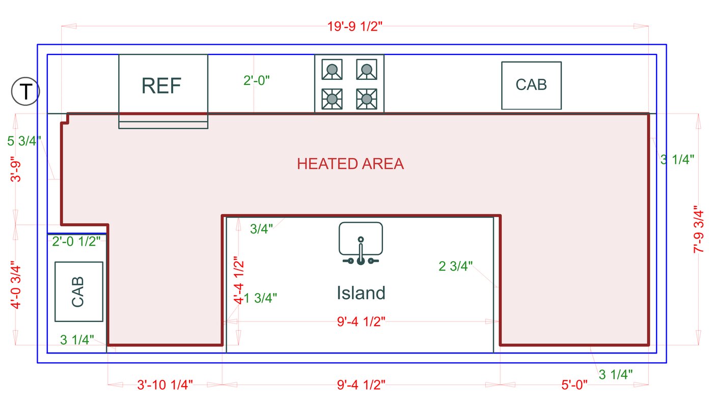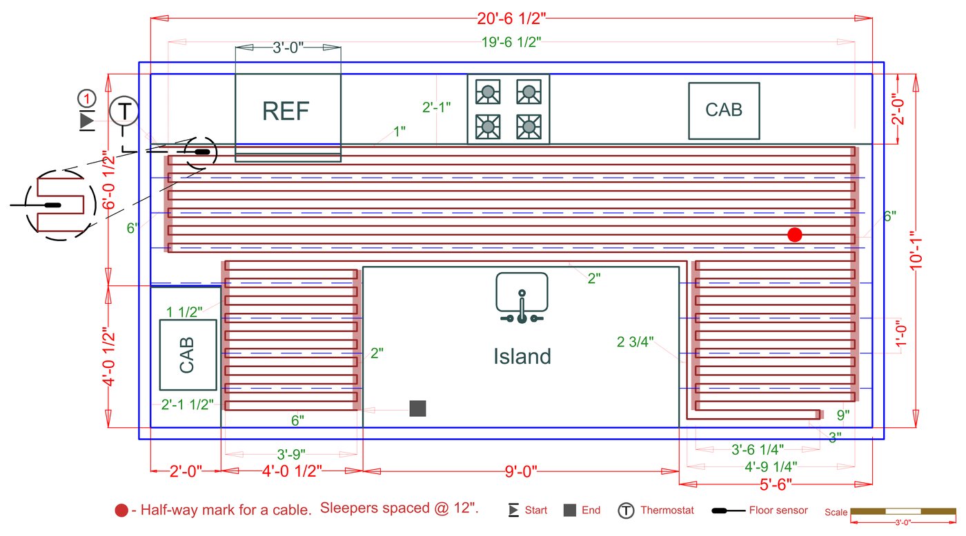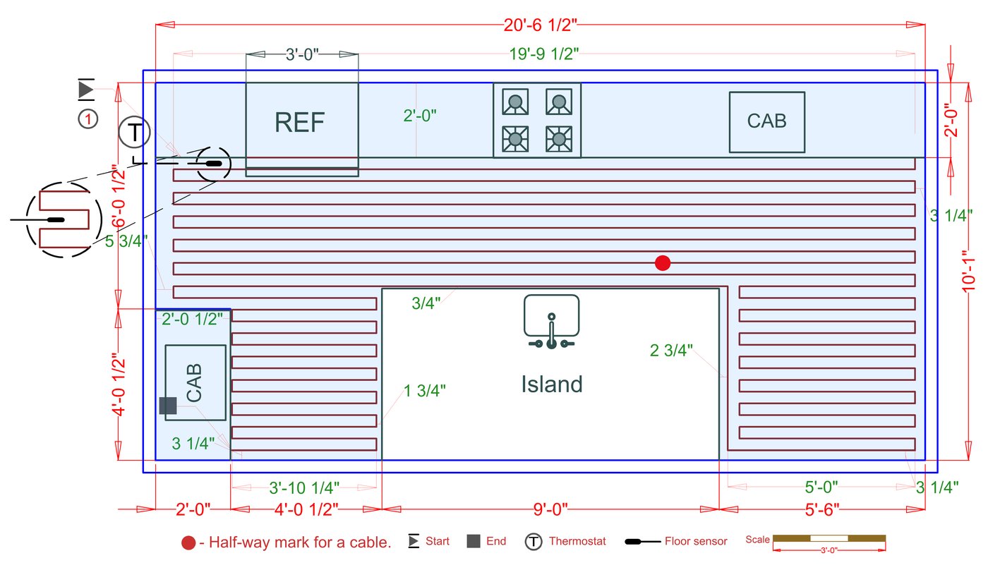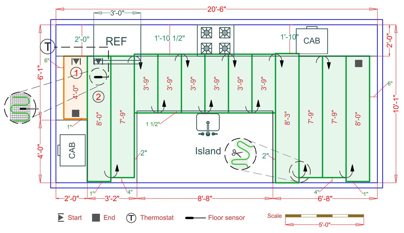 WarmlyYours offers a heating system for all of the most common flooring surfaces, including tile, stone, and marble. Each system type has unique advantages and best applications. Below you will find several different floor plans that are based on this example kitchen. Each breakdown is based on a different heating element and each breakdown will provide product information and costs. If you have any questions about which system type would be best for your project, you can contact us directly.