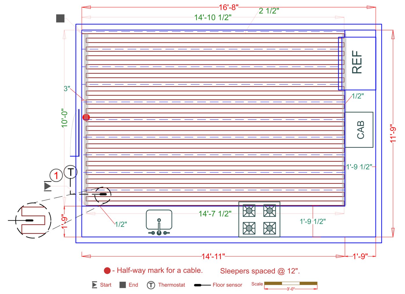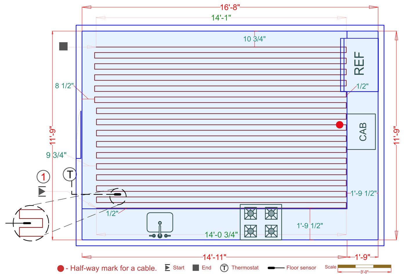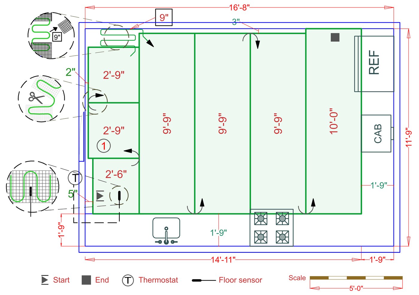 WarmlyYours offers a heating system for all of the most common flooring surfaces, including tile, stone, and marble. Each system type has unique advantages and best applications. Below you will find several different floor plans that are based on this example kitchen. Each breakdown is based on a different heating element and each breakdown will provide product information and costs. If you have any questions about which system type would be best for your project, you can contact us directly.