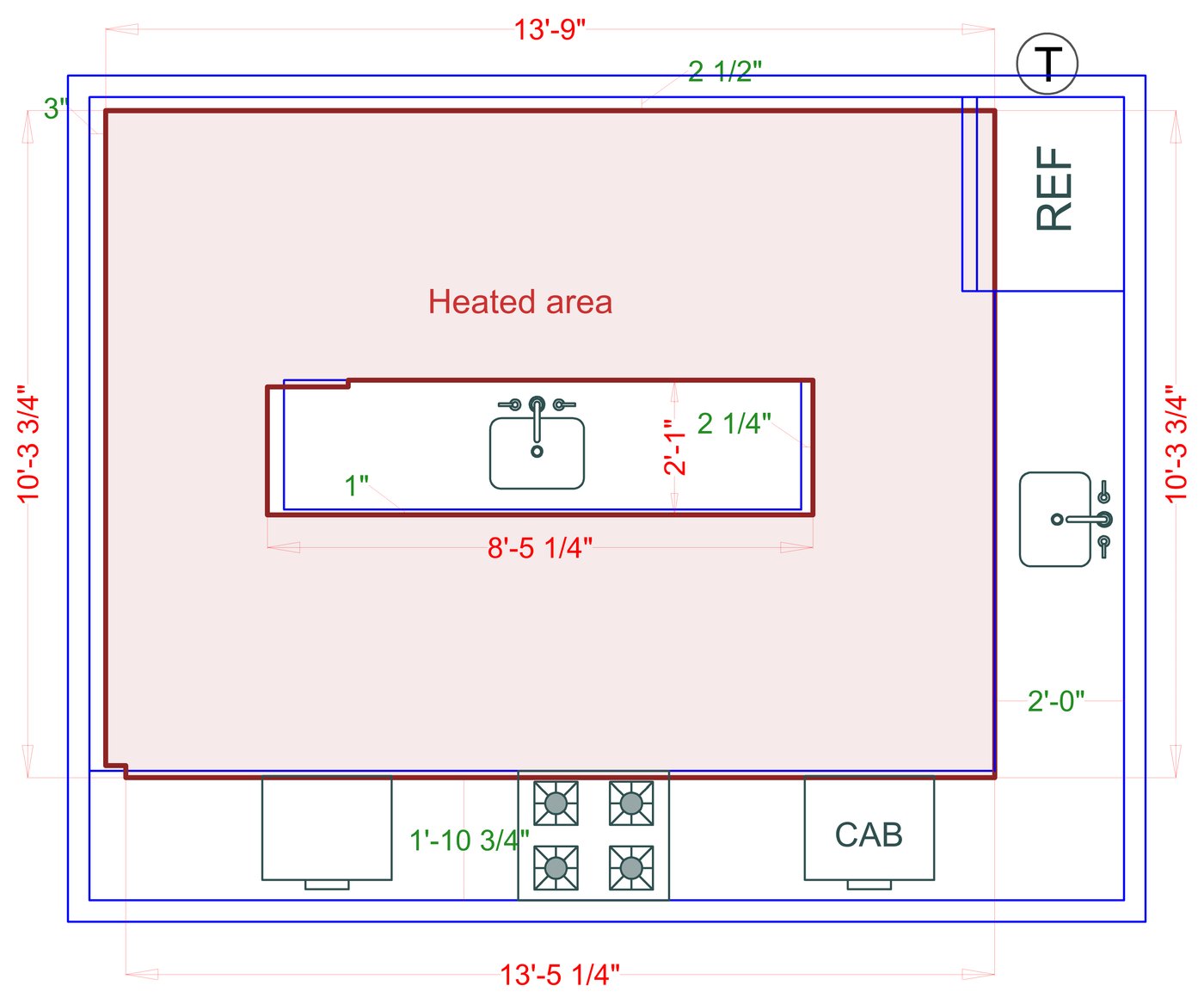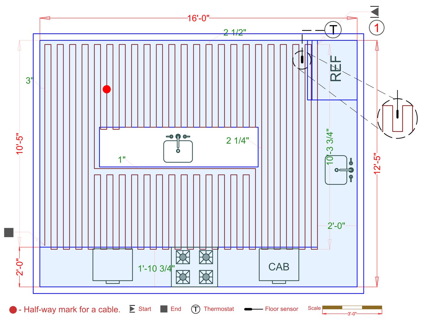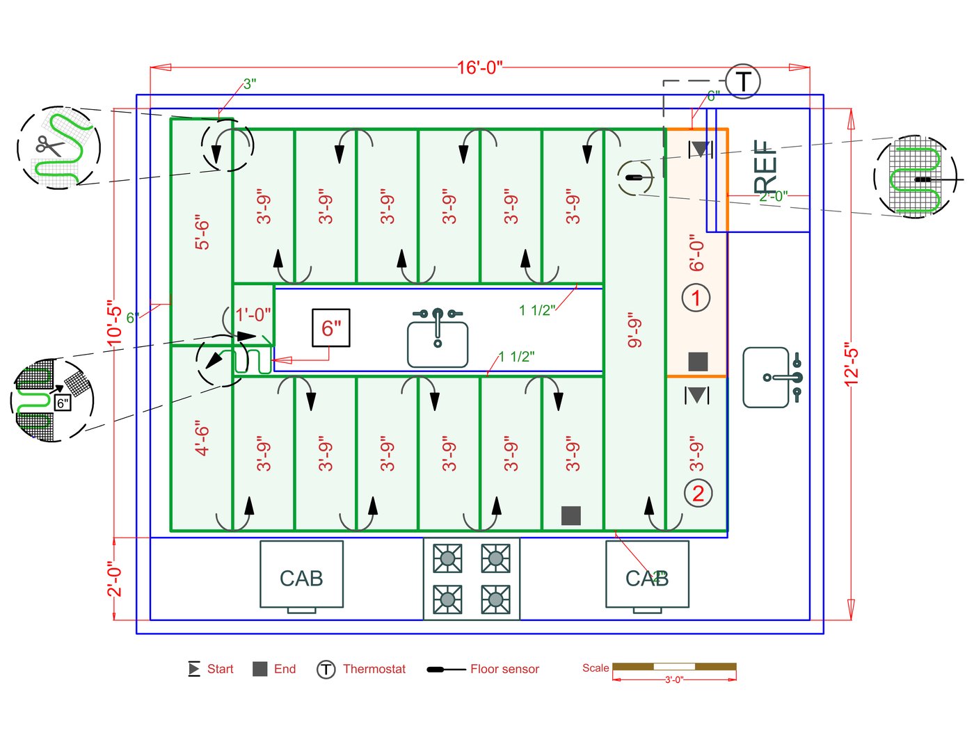 WarmlyYours offers a heating system for all of the most common flooring surfaces, including tile, stone, and marble. Each system type has unique advantages and best applications. Below you will find several different floor plans that are based on this example kitchen. Each breakdown is based on a different heating element and each breakdown will provide product information and costs. If you have any questions about which system type would be best for your project, you can contact us directly.
