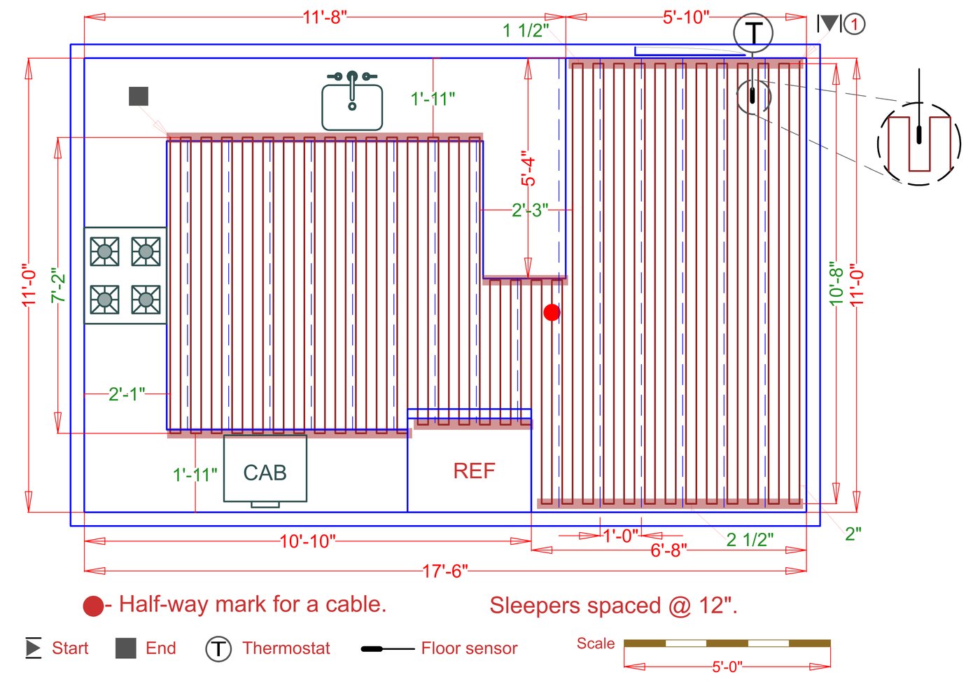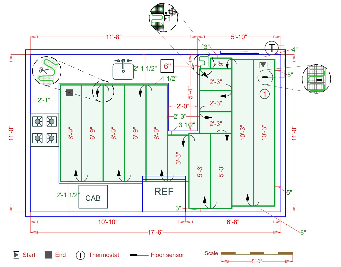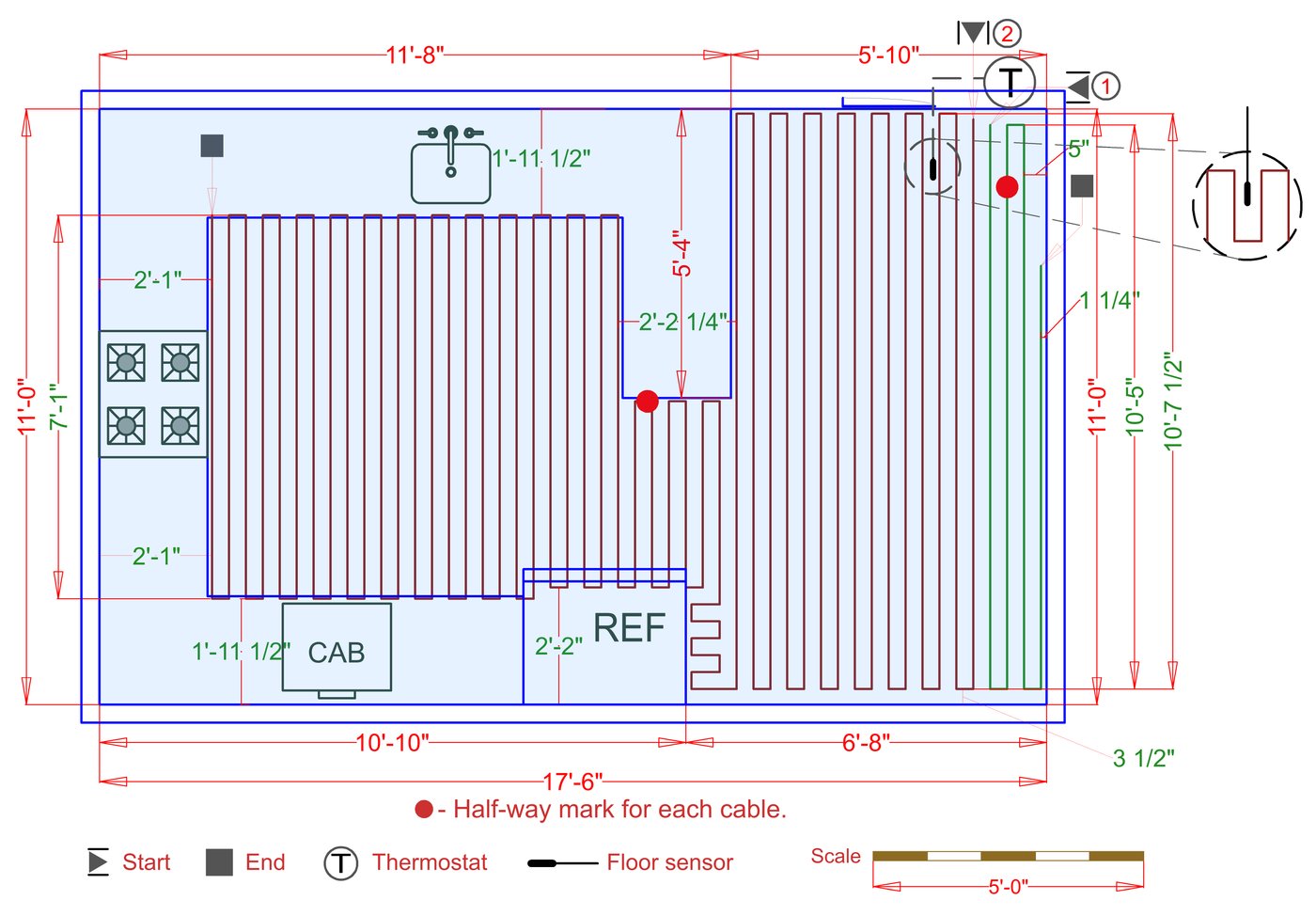 WarmlyYours offers a heating system for all of the most common flooring surfaces, including tile, stone, and marble. Each system type has unique advantages and best applications. Below you will find several different floor plans that are based on this example kitchen. Each breakdown is based on a different heating element and each breakdown will provide product information and costs. If you have any questions about which system type would be best for your project, you can contact us directly.