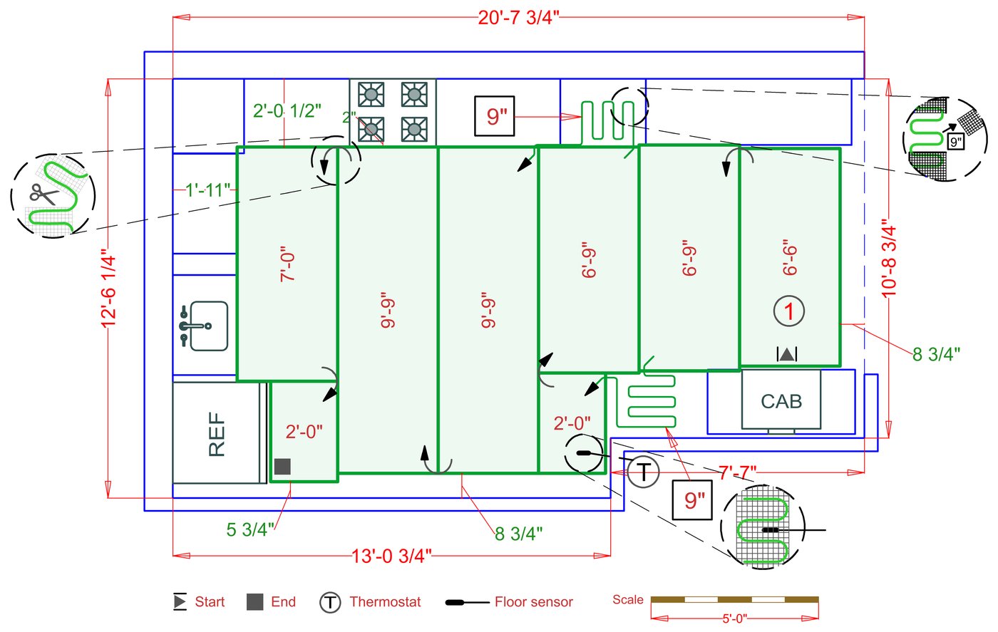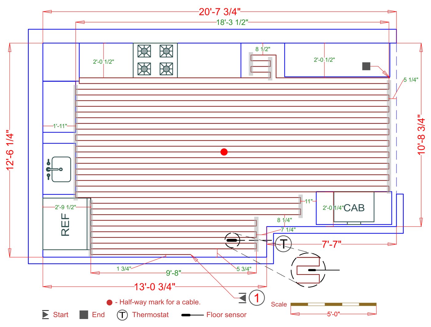 WarmlyYours offers a heating system for all of the most common flooring surfaces, including tile, stone, and marble. Each system type has unique advantages and best applications. Below you will find several different floor plans that are based on this example kitchen. Each breakdown is based on a different heating element and each breakdown will provide product information and costs. If you have any questions about which system type would be best for your project, you can contact us directly.Click on any of these available installation options below to see an example floor plan and project breakdown: