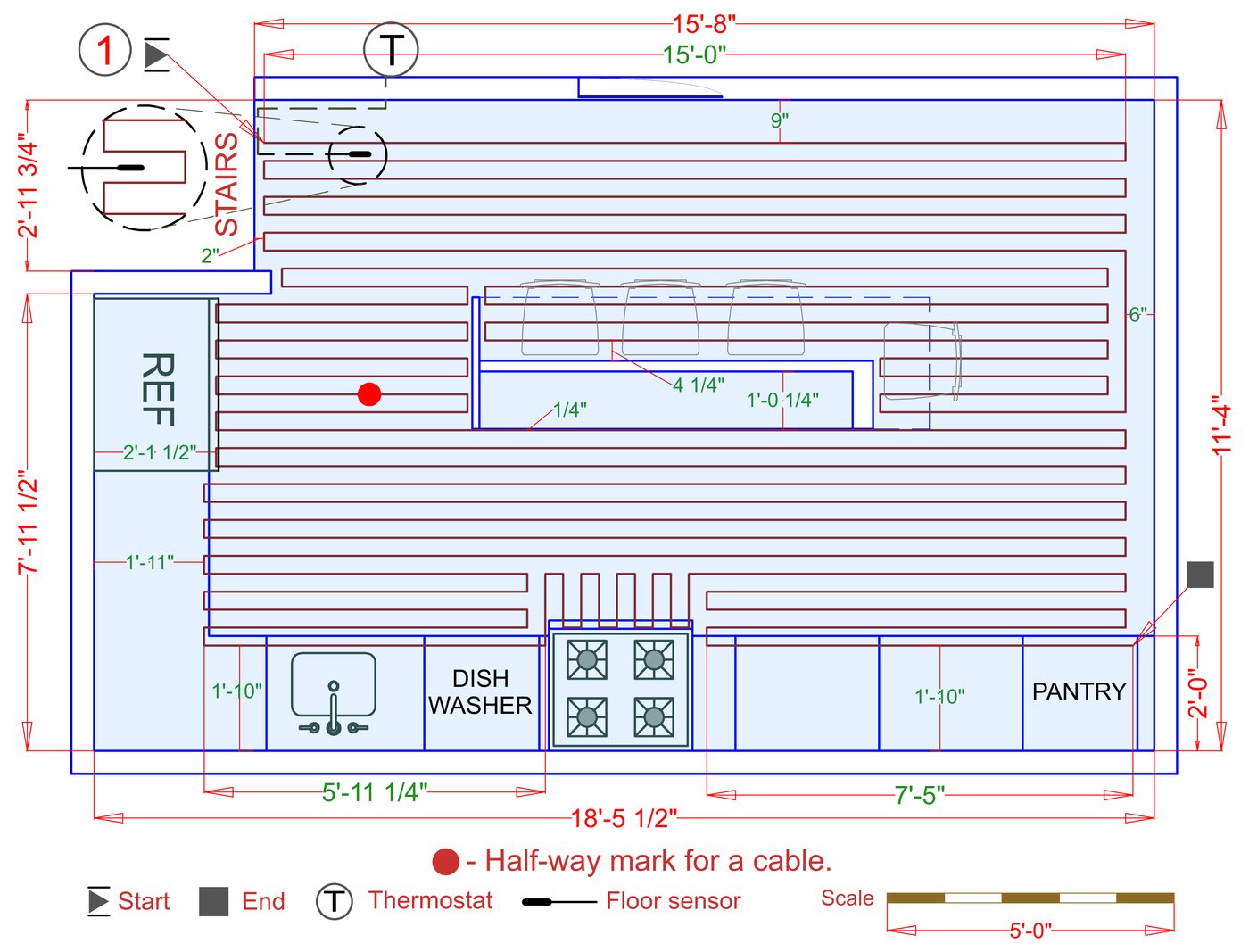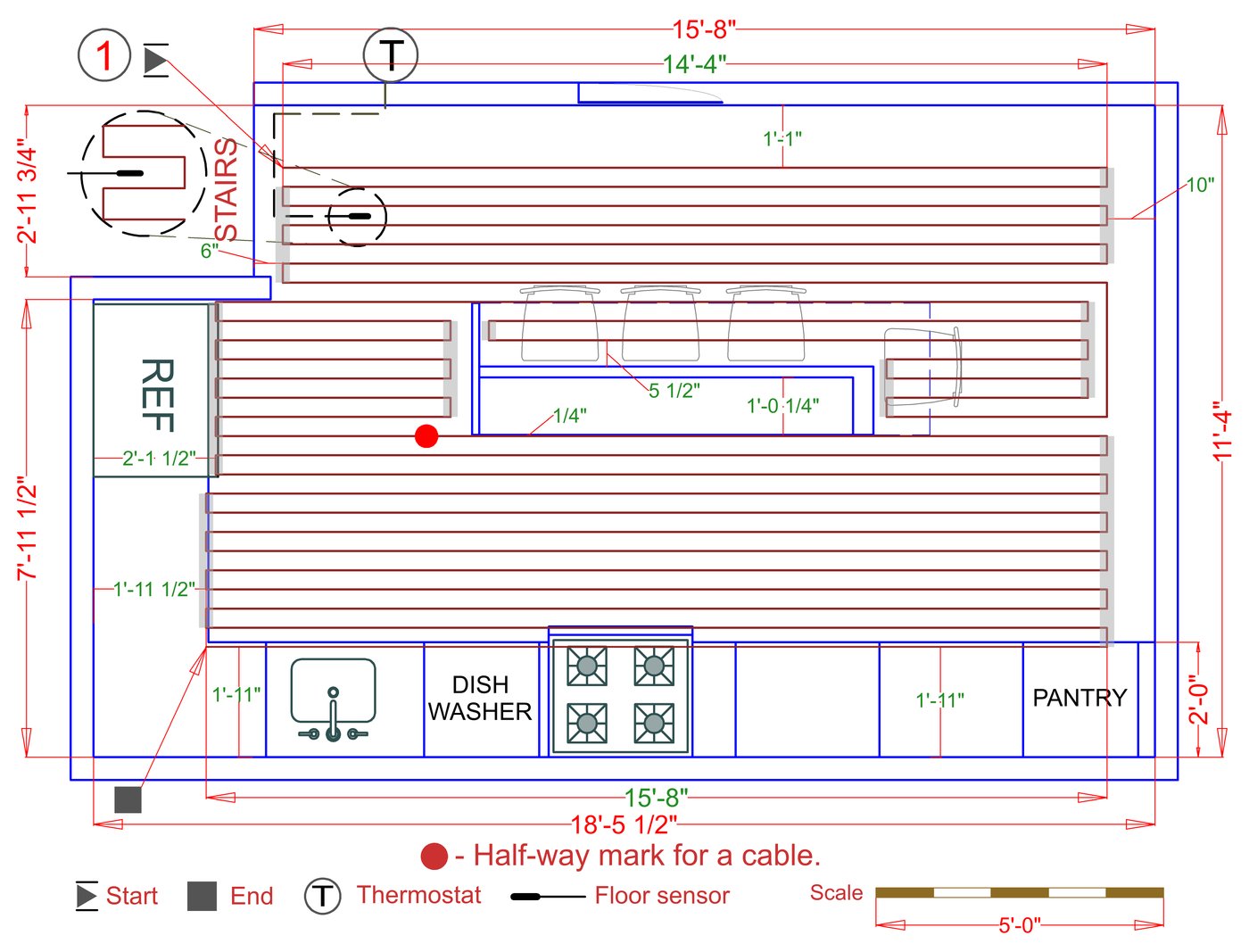 WarmlyYours offers a heating system for all of the most common flooring surfaces, including tile, stone, and marble. Each system type has unique advantages and best applications. Below you will find several different floor plans that are based on this example kitchen. Each breakdown is based on a different heating element and each breakdown will provide product information and costs. If you have any questions about which system type would be best for your project, you can contact us directly.Click on any of these available installation options below to see an example floor plan and project breakdown: