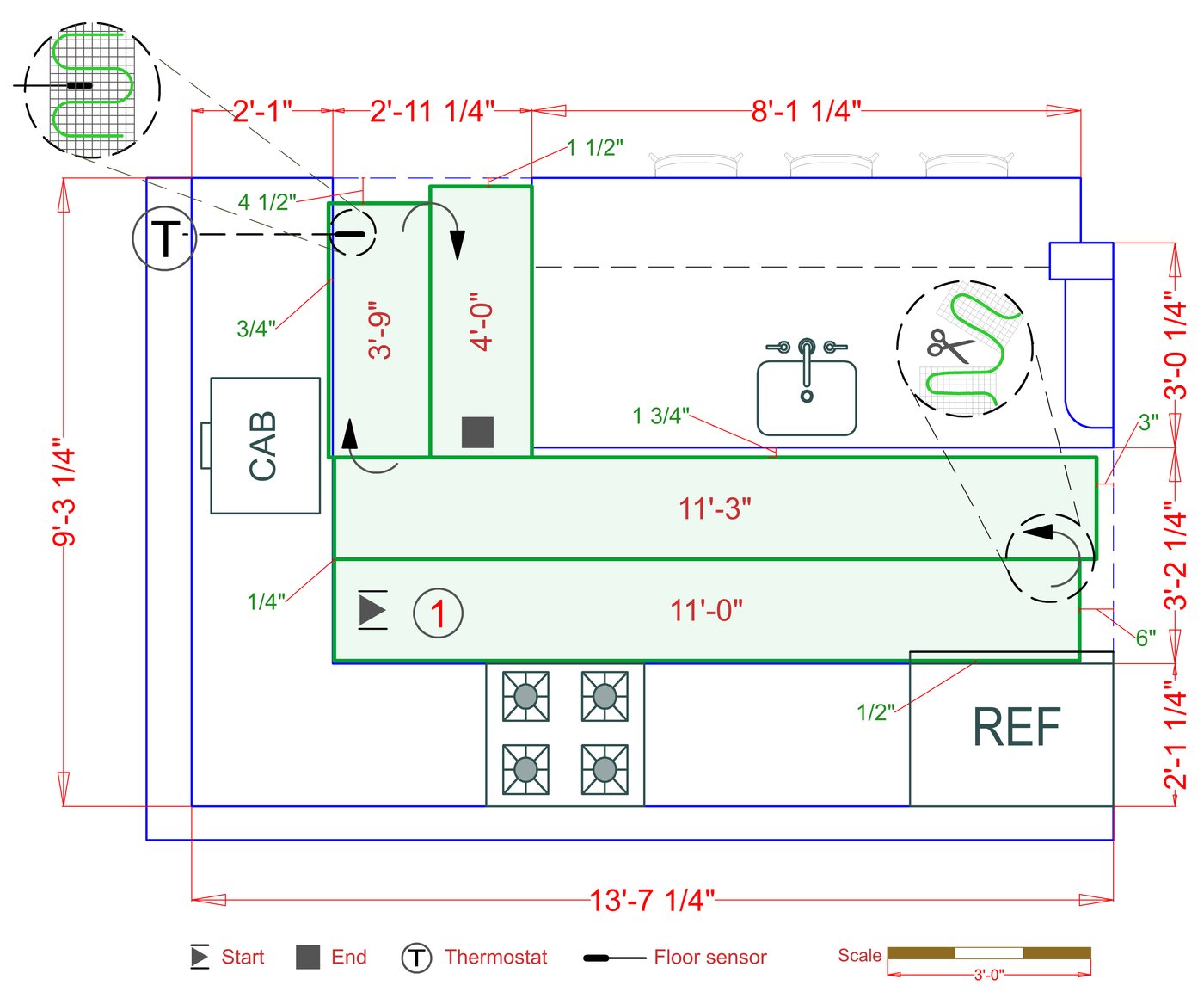 WarmlyYours offers a heating system for all of the most common flooring surfaces, including tile, stone, and marble. Each system type has unique advantages and best applications. Below you will find several different floor plans that are based on this example kitchen. Each breakdown is based on a different heating element and each breakdown will provide product information and costs. If you have any questions about which system type would be best for your project, you can contact us directly.Click on any of these available installation options below to see an example floor plan and project breakdown: