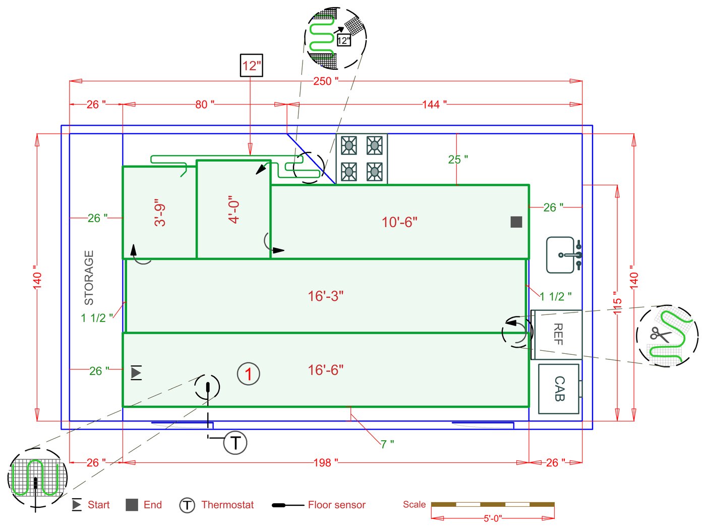 WarmlyYours offers a heating system for all of the most common flooring surfaces, including tile, stone, and marble. Each system type has unique advantages and best applications. Below you will find several different floor plans that are based on this example kitchen. Each breakdown is based on a different heating element and each breakdown will provide product information and costs. If you have any questions about which system type would be best for your project, you can contact us directly.Click on any of these available installation options below to see an example floor plan and project breakdown: