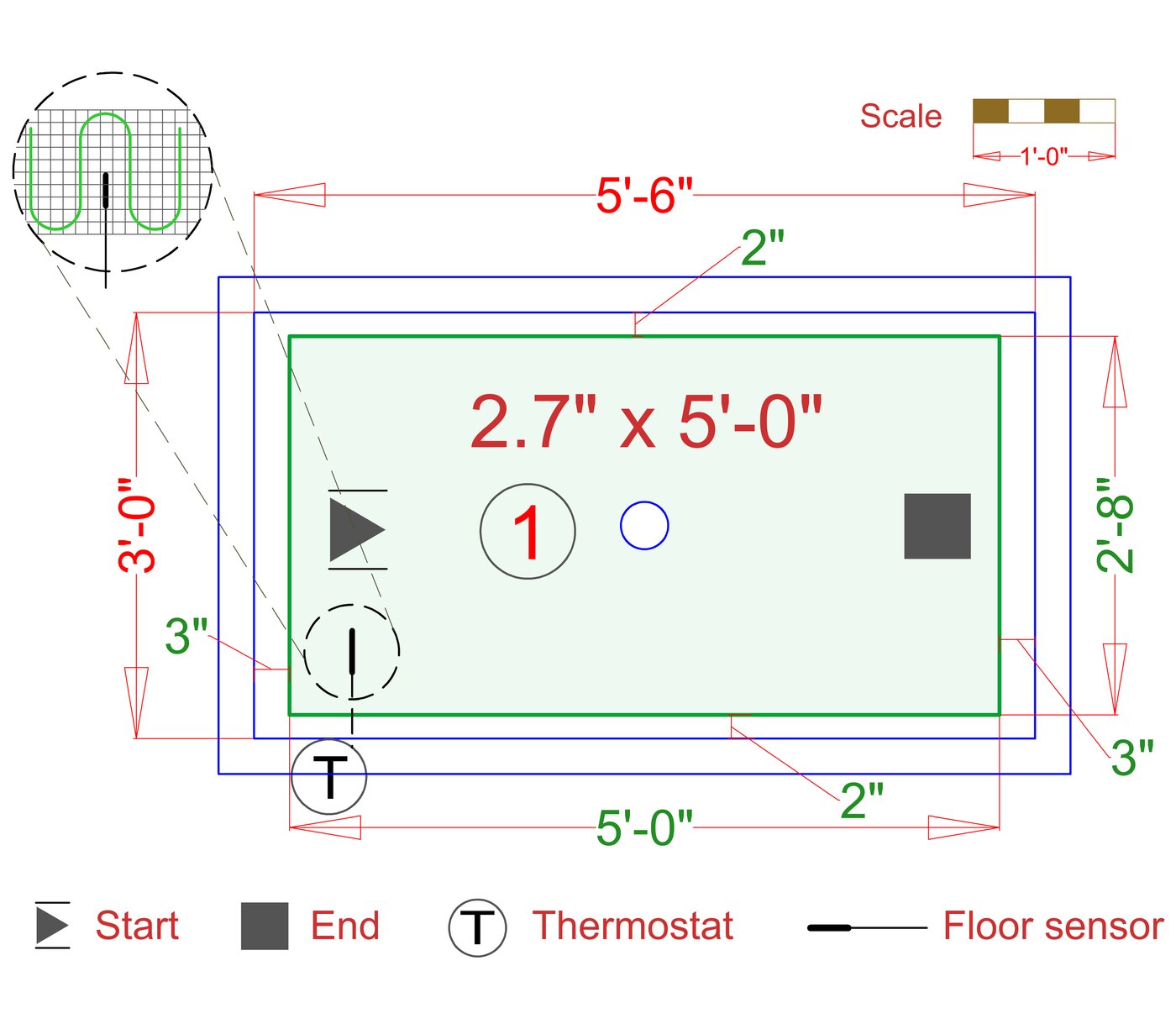 WarmlyYours offers a heating system for all of the most common flooring surfaces, including tile, stone, and marble. Each system type has unique advantages and best applications. Below you will find several different floor plans that are based on this example shower. Each breakdown is based on a different heating element and each breakdown will provide product information and costs. If you have any questions about which system type would be best for your project, you can contact us directly.