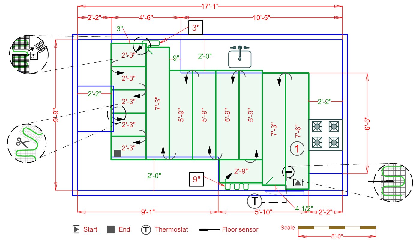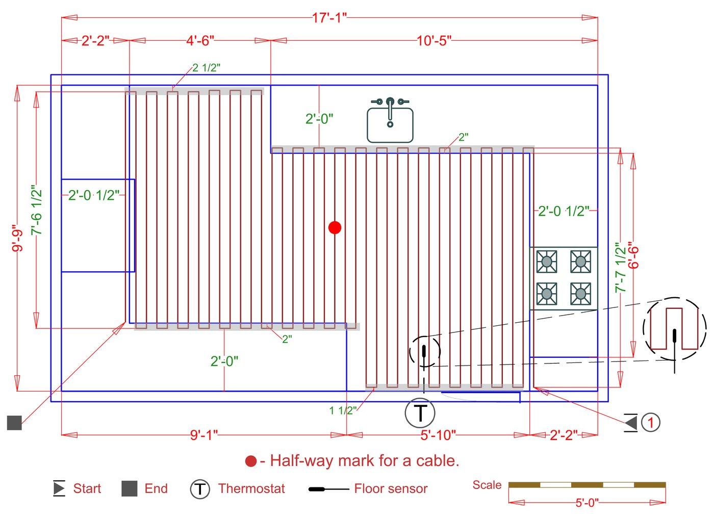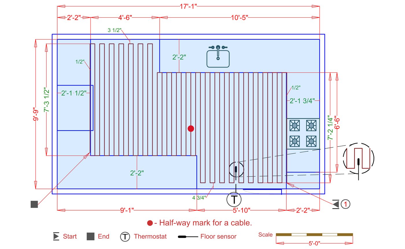 WarmlyYours offers a heating system for all of the most common flooring surfaces, including tile, stone, and marble. Each system type has unique advantages and best applications. Below you will find several different floor plans that are based on this example kitchen. Each breakdown is based on a different heating element and each breakdown will provide product information and costs. If you have any questions about which system type would be best for your project, you can contact us directly.Click on any of these available installation options below to see an example floor plan and project breakdown: