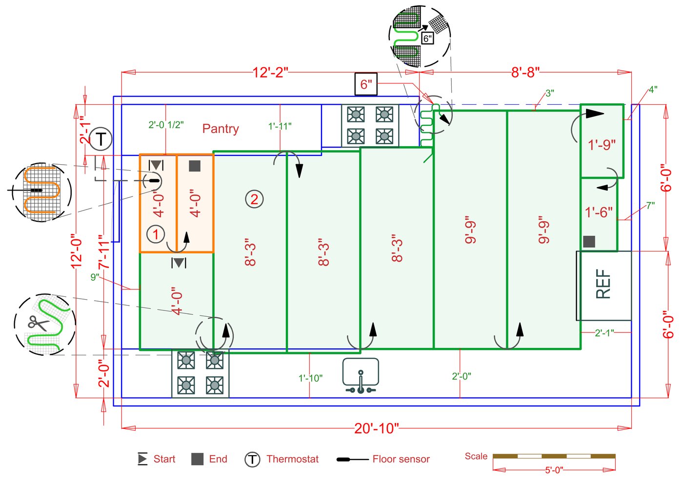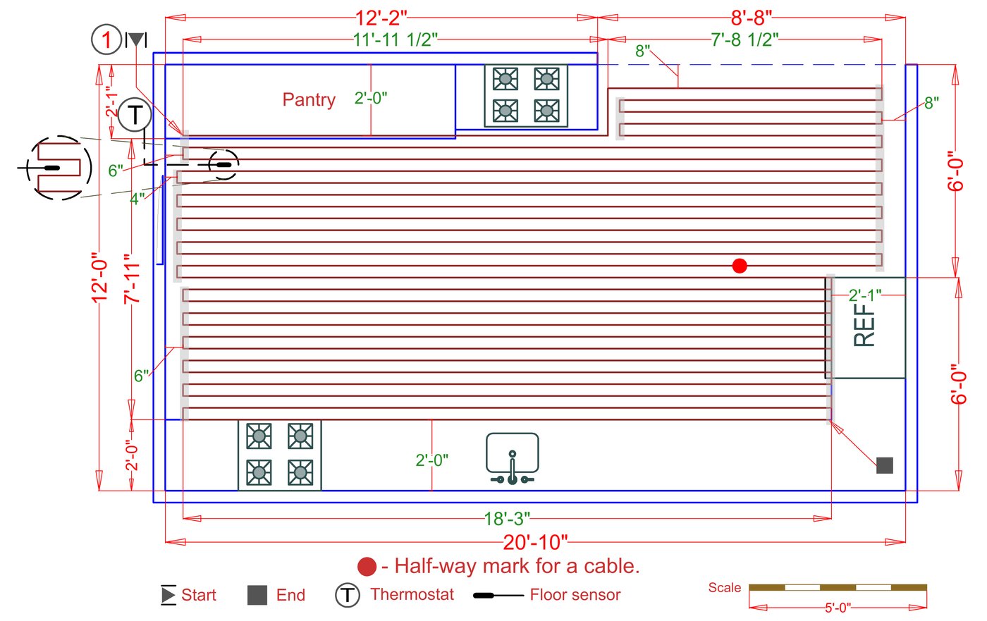 WarmlyYours offers a heating system for all of the most common flooring surfaces, including tile, stone, and marble. Each system type has unique advantages and best applications. Below you will find several different floor plans that are based on this example kitchen. Each breakdown is based on a different heating element and each breakdown will provide product information and costs. If you have any questions about which system type would be best for your project, you can contact us directly.Click on any of these available installation options below to see an example floor plan and project breakdown:
