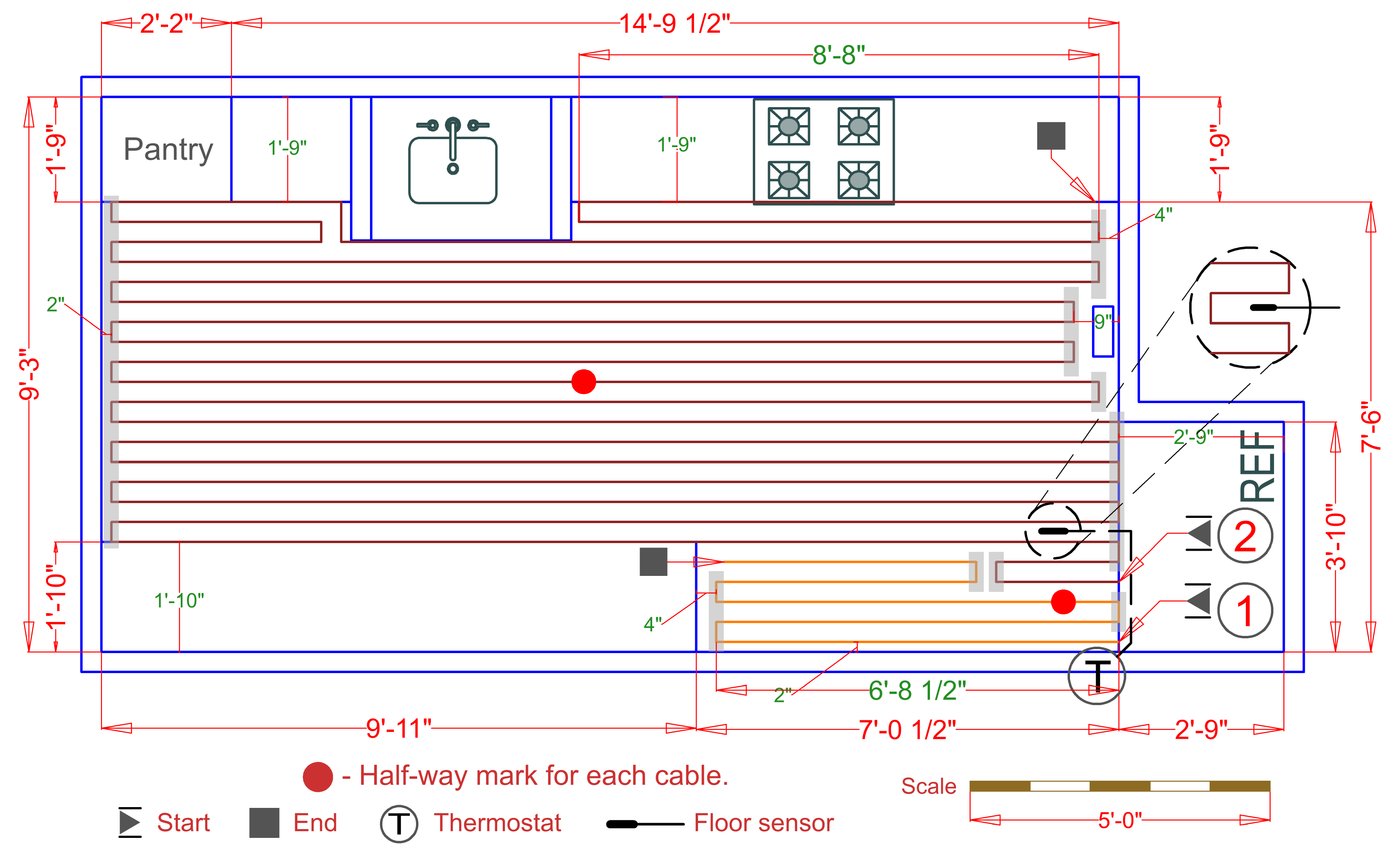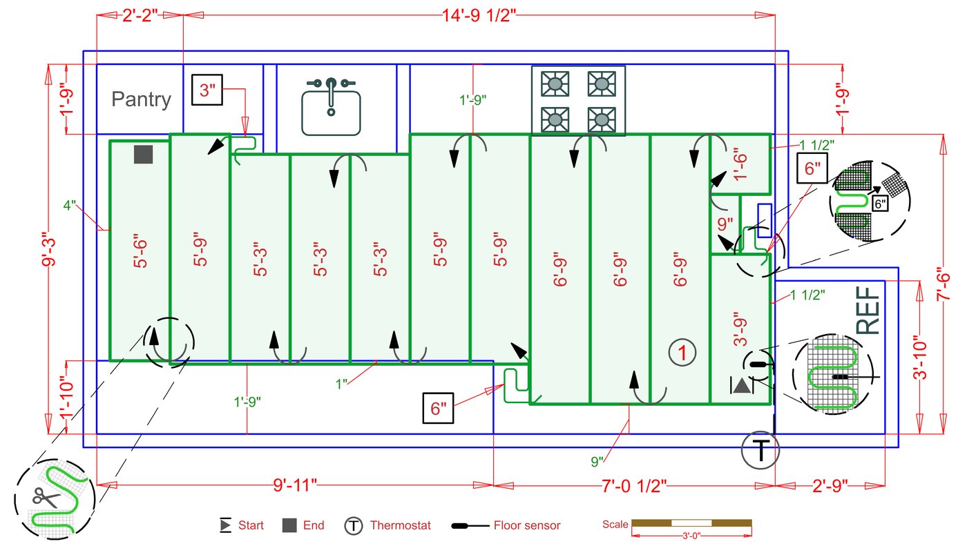 WarmlyYours offers a heating system for all of the most common flooring surfaces, including tile, stone, and marble. Each system type has unique advantages and best applications. Below you will find several different floor plans that are based on this example kitchen. Each breakdown is based on a different heating element and each breakdown will provide product information and costs. If you have any questions about which system type would be best for your project, you can contact us directly.Click on any of these available installation options below to see an example floor plan and project breakdown: