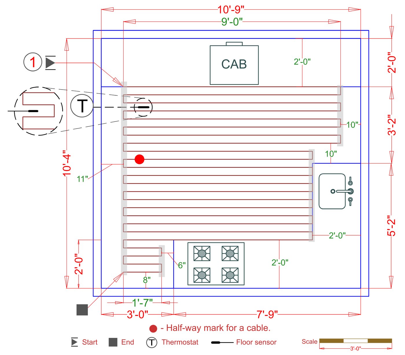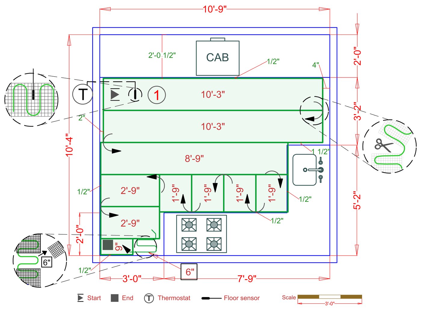 WarmlyYours offers a heating system for all of the most common flooring surfaces, including tile, stone, and marble. Each system type has unique advantages and best applications. Below you will find several different floor plans that are based on this example kitchen. Each breakdown is based on a different heating element and each breakdown will provide product information and costs. If you have any questions about which system type would be best for your project, you can contact us directly.Click on any of these available installation options below to see an example floor plan and project breakdown:
