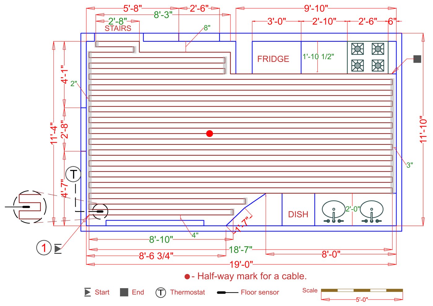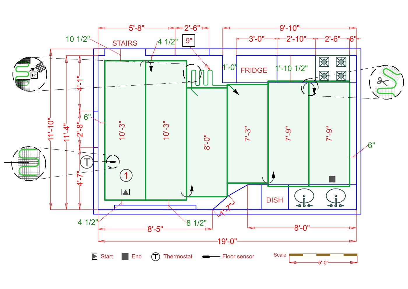 WarmlyYours offers a heating system for all of the most common flooring surfaces, including tile, stone, and marble. Each system type has unique advantages and best applications. Below you will find several different floor plans that are based on this example kitchen. Each breakdown is based on a different heating element and each breakdown will provide product information and costs. If you have any questions about which system type would be best for your project, you can contact us directly.Click on any of these available installation options below to see an example floor plan and project breakdown: