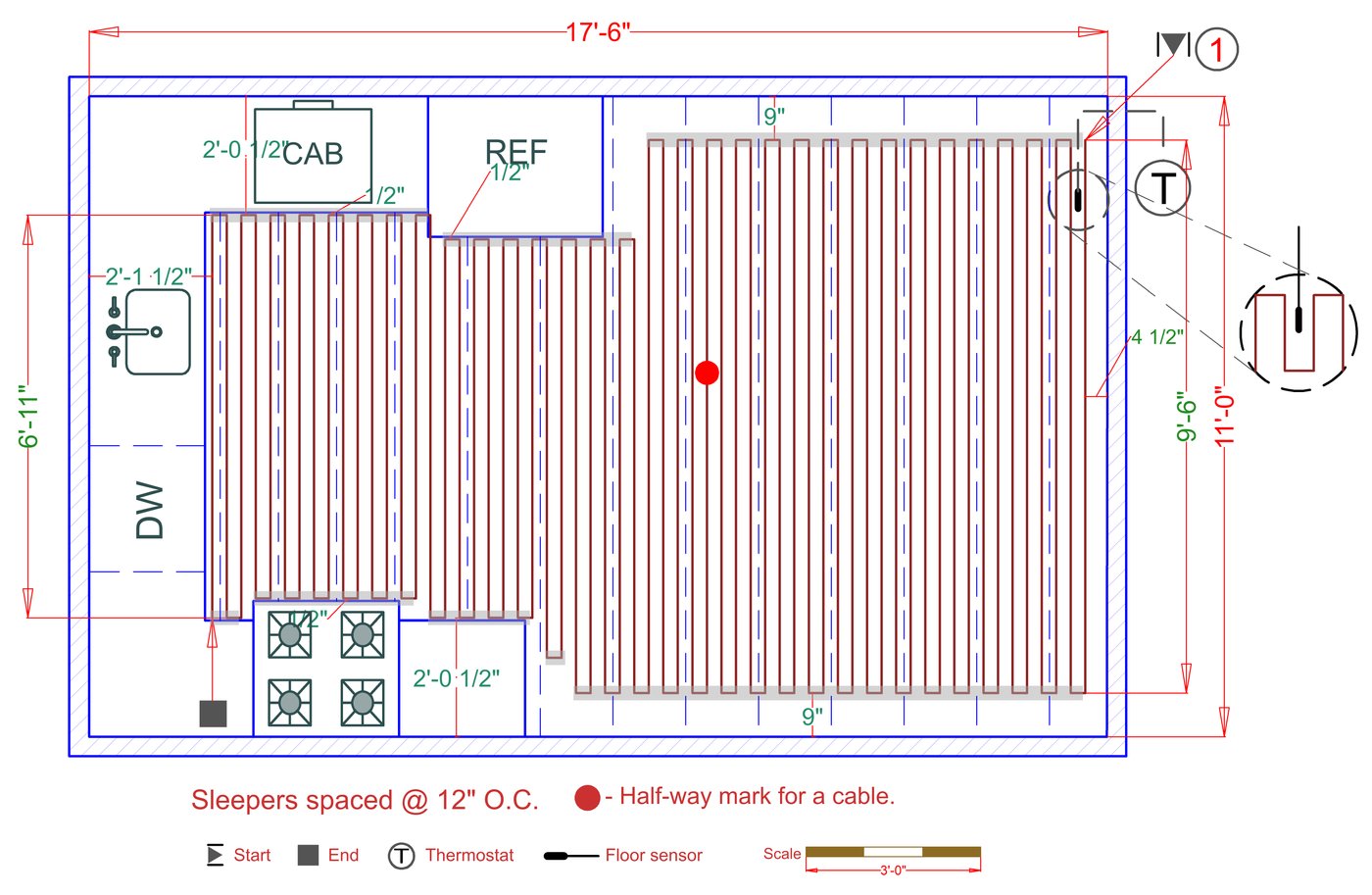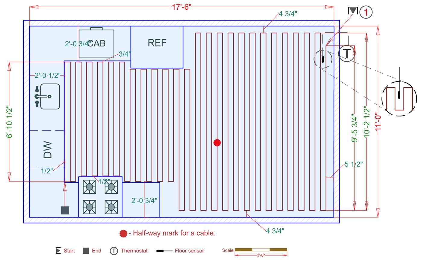 WarmlyYours offers a heating system for all of the most common flooring surfaces, including tile, stone, and marble. Each system type has unique advantages and best applications. Below you will find several different floor plans that are based on this example kitchen. Each breakdown is based on a different heating element and each breakdown will provide product information and costs. If you have any questions about which system type would be best for your project, you can contact us directly.