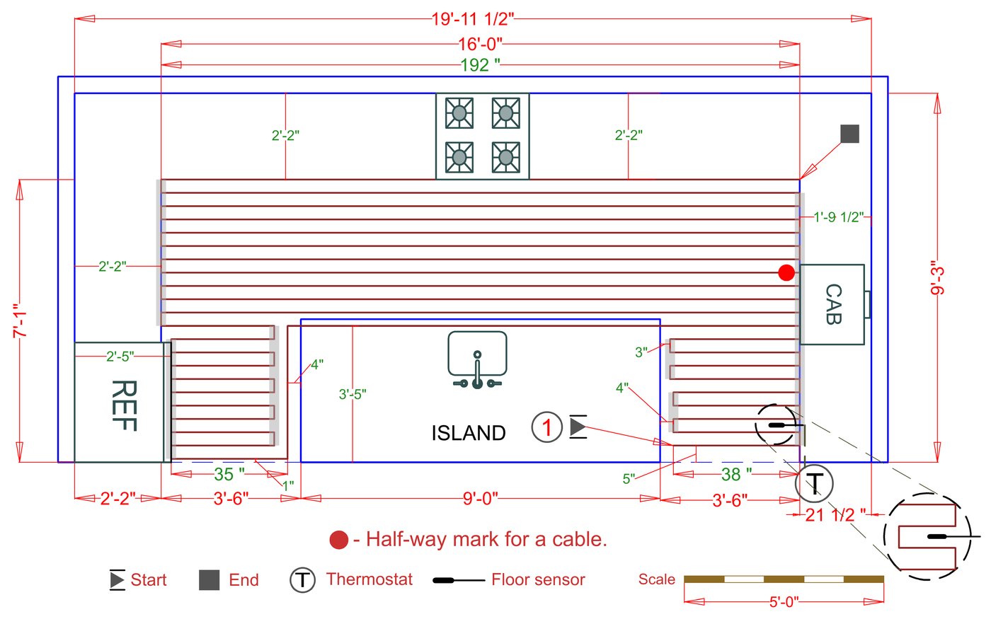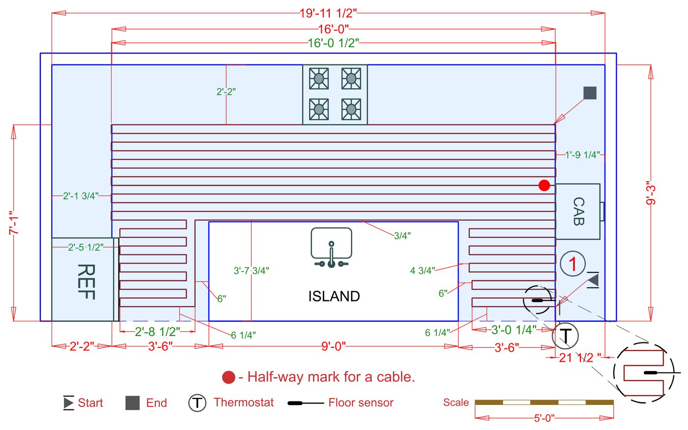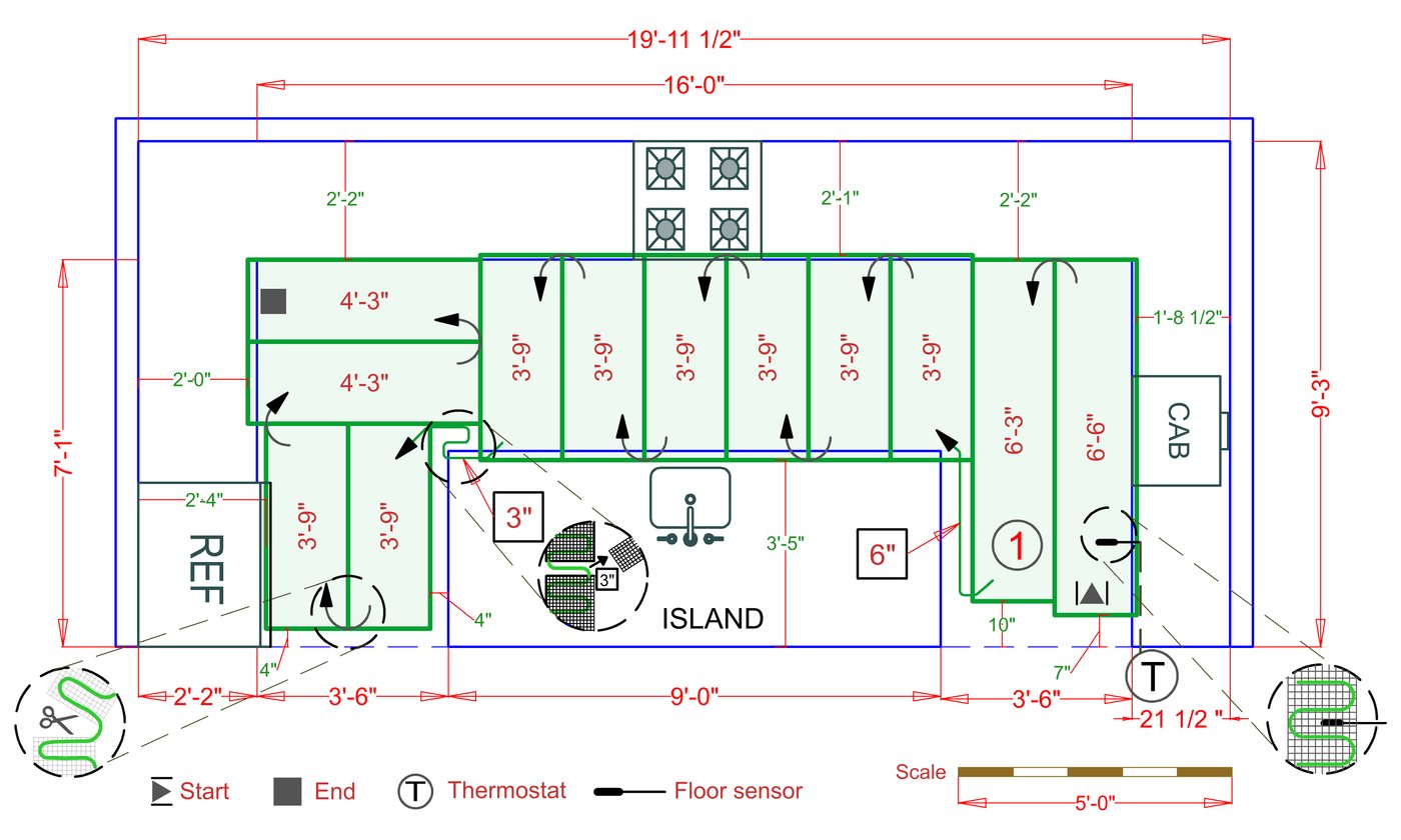 WarmlyYours offers a heating system for all of the most common flooring surfaces, including tile, stone, and marble. Each system type has unique advantages and best applications. Below you will find several different floor plans that are based on this example kitchen. Each breakdown is based on a different heating element and each breakdown will provide product information and costs. If you have any questions about which system type would be best for your project, you can contact us directly.Click on any of these available installation options below to see an example floor plan and project breakdown: