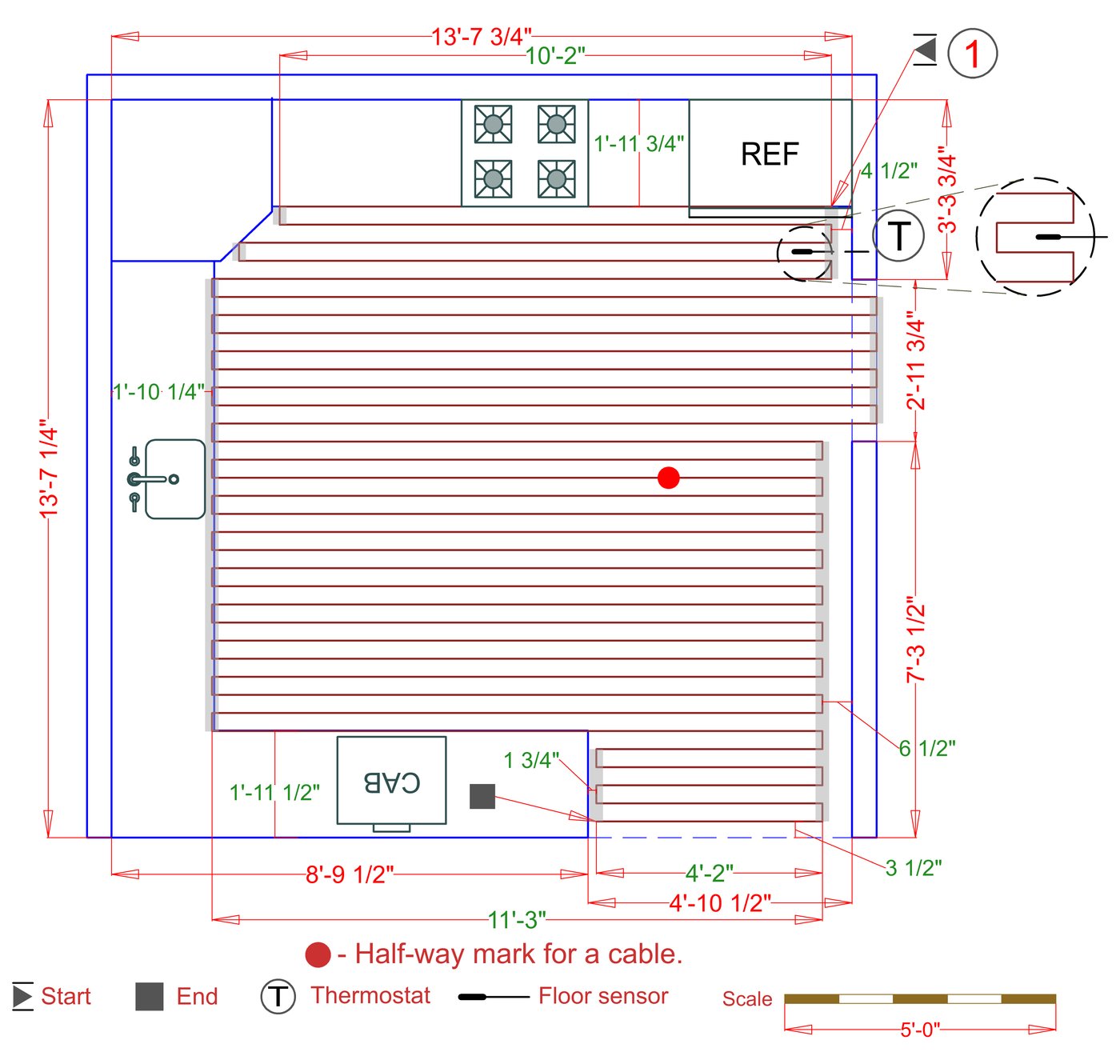 WarmlyYours offers a heating system for all of the most common flooring surfaces, including tile, stone, and marble. Each system type has unique advantages and best applications. Below you will find several different floor plans that are based on this example kitchen. Each breakdown is based on a different heating element and each breakdown will provide product information and costs. If you have any questions about which system type would be best for your project, you can contact us directly.Click on any of these available installation options below to see an example floor plan and project breakdown: