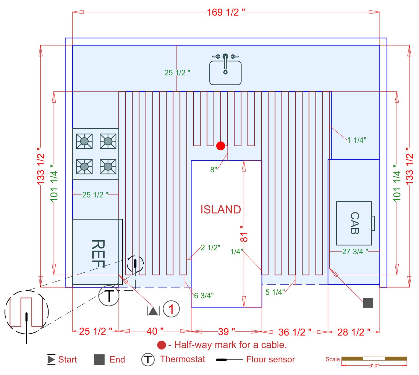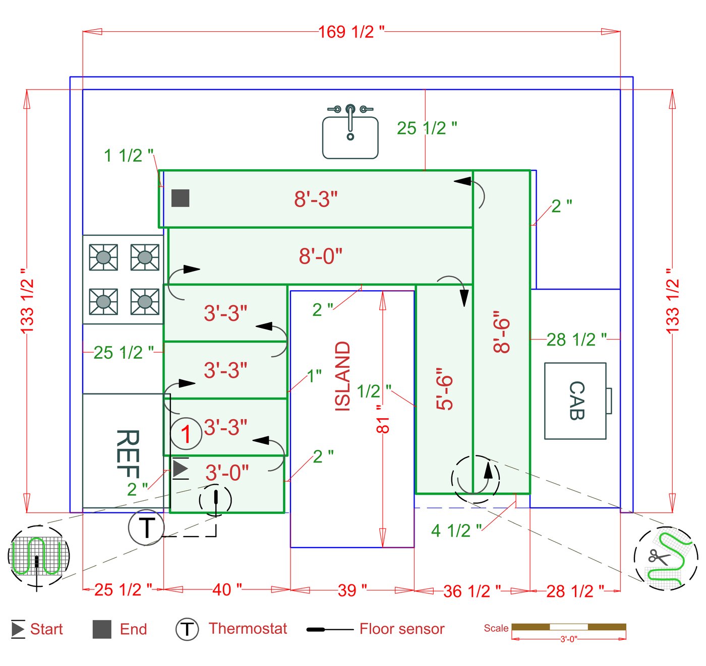 WarmlyYours offers a heating system for all of the most common flooring surfaces, including tile, stone, and marble. Each system type has unique advantages and best applications. Below you will find several different floor plans that are based on this example kitchen. Each breakdown is based on a different heating element and each breakdown will provide product information and costs. If you have any questions about which system type would be best for your project, you can contact us directly.Click on any of these available installation options below to see an example floor plan and project breakdown: