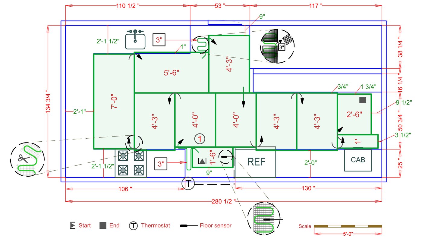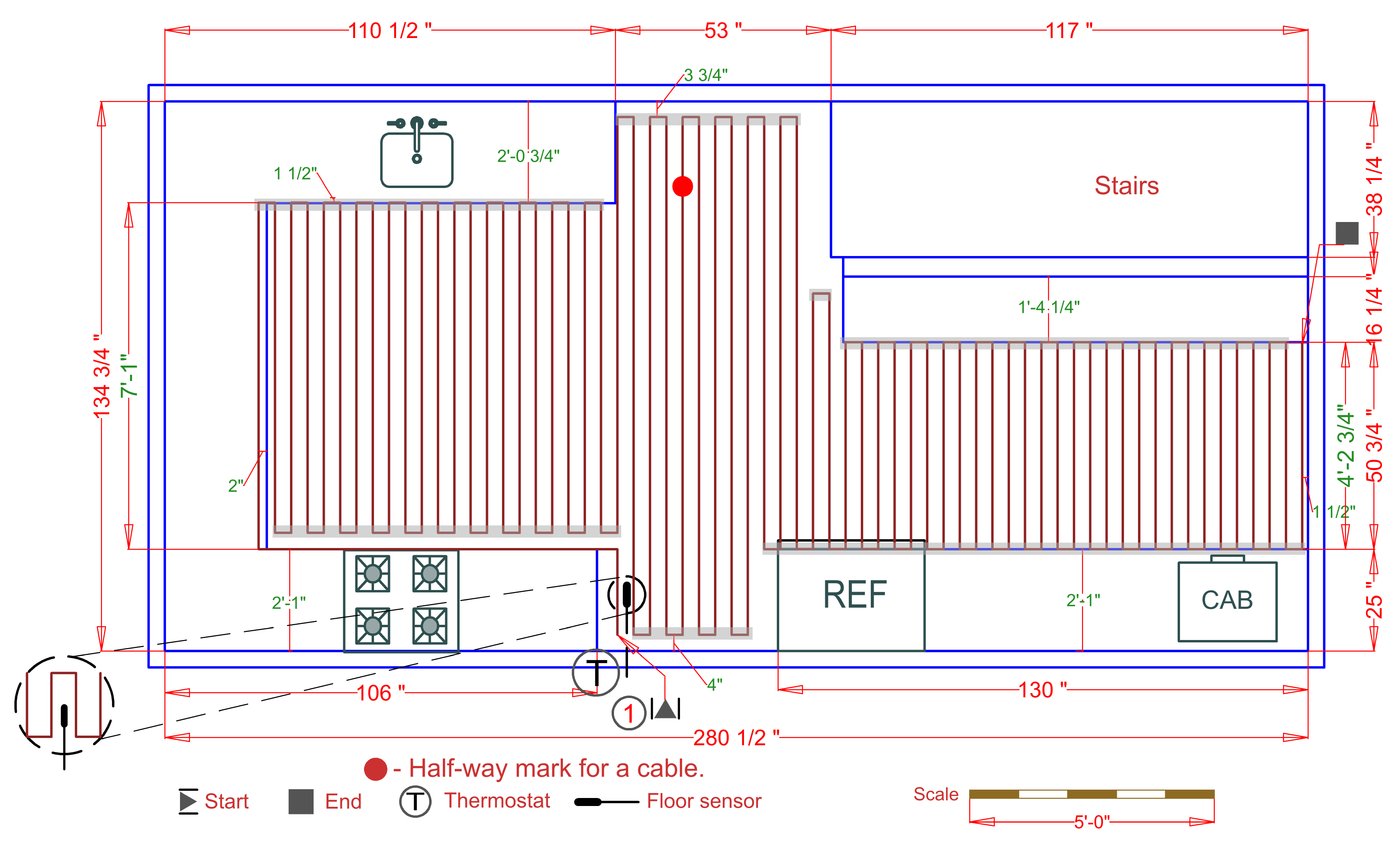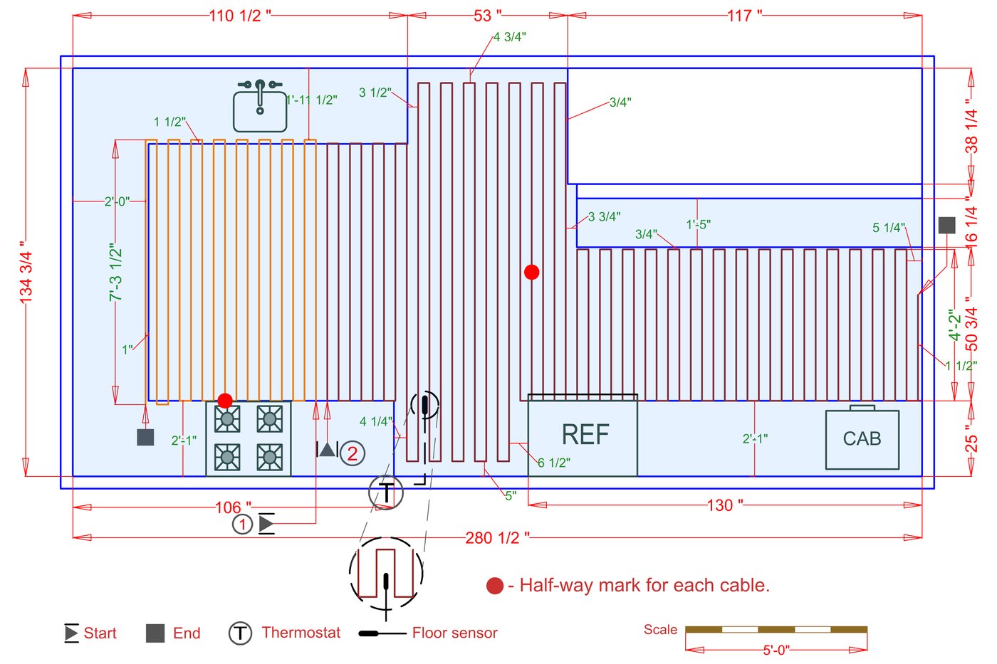 WarmlyYours offers a heating system for all of the most common flooring surfaces, including tile, stone, and marble. Each system type has unique advantages and best applications. Below you will find several different floor plans that are based on this example kitchen. Each breakdown is based on a different heating element and each breakdown will provide product information and costs. If you have any questions about which system type would be best for your project, you can contact us directly.Click on any of these available installation options below to see an example floor plan and project breakdown:
