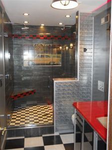 Summary: A client of Store with Style wanted a “car-themed” bathroom—and Kathy Wallace delivered with radiant heat beneath the race-ready floor.
