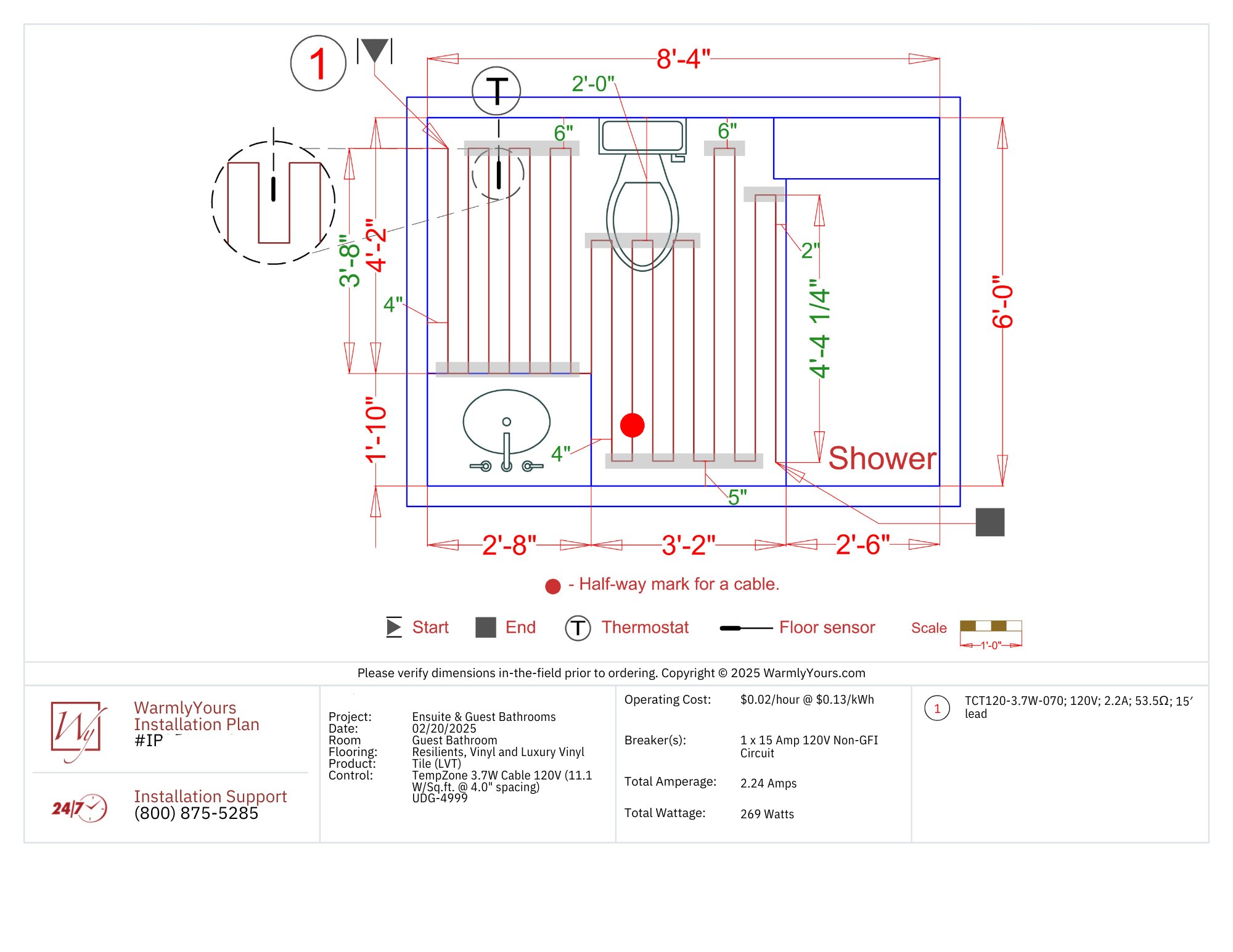 While WarmlyYours electric radiant floor heating systems are typically installed by your floor covering contractor, a licensed electrician is recommended for the final thermostat hook-up. With every quote, we provide an Installation Plan layout, together with an electrical plan that has all the info required for the electrician.