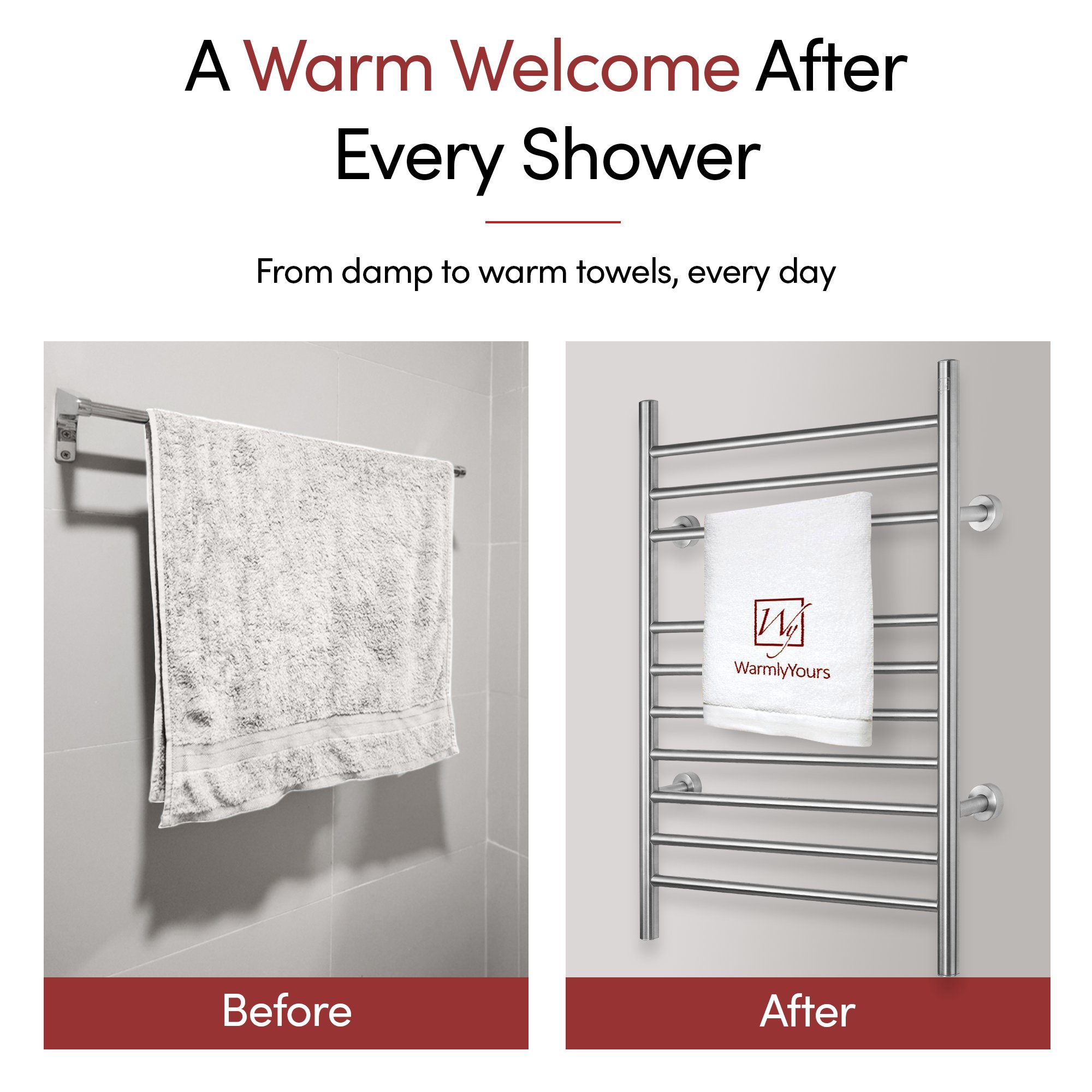 Imagine stepping out of the shower every morning and being able to use fresh-from-the-dryer towels. Now imagine not having to throw your towels in the dryer every morning or run to the laundry room after your shower. The WarmlyYours Infinity electric towel warmer allows you to do just that. With ten bars, this towel rack is convenient and versatile, with enough space for 2 large towels to be warmed at one time. The Infinity towel warmer is made of stainless steel and features a beautiful brushed finish that is durable and attractive. This model has ten sleek bars, from which you can hang your towels or bathrobe for a cozy, luxurious experience every day. Step out of the shower or bath every day and wrap yourself in freshly-warmed towels.
