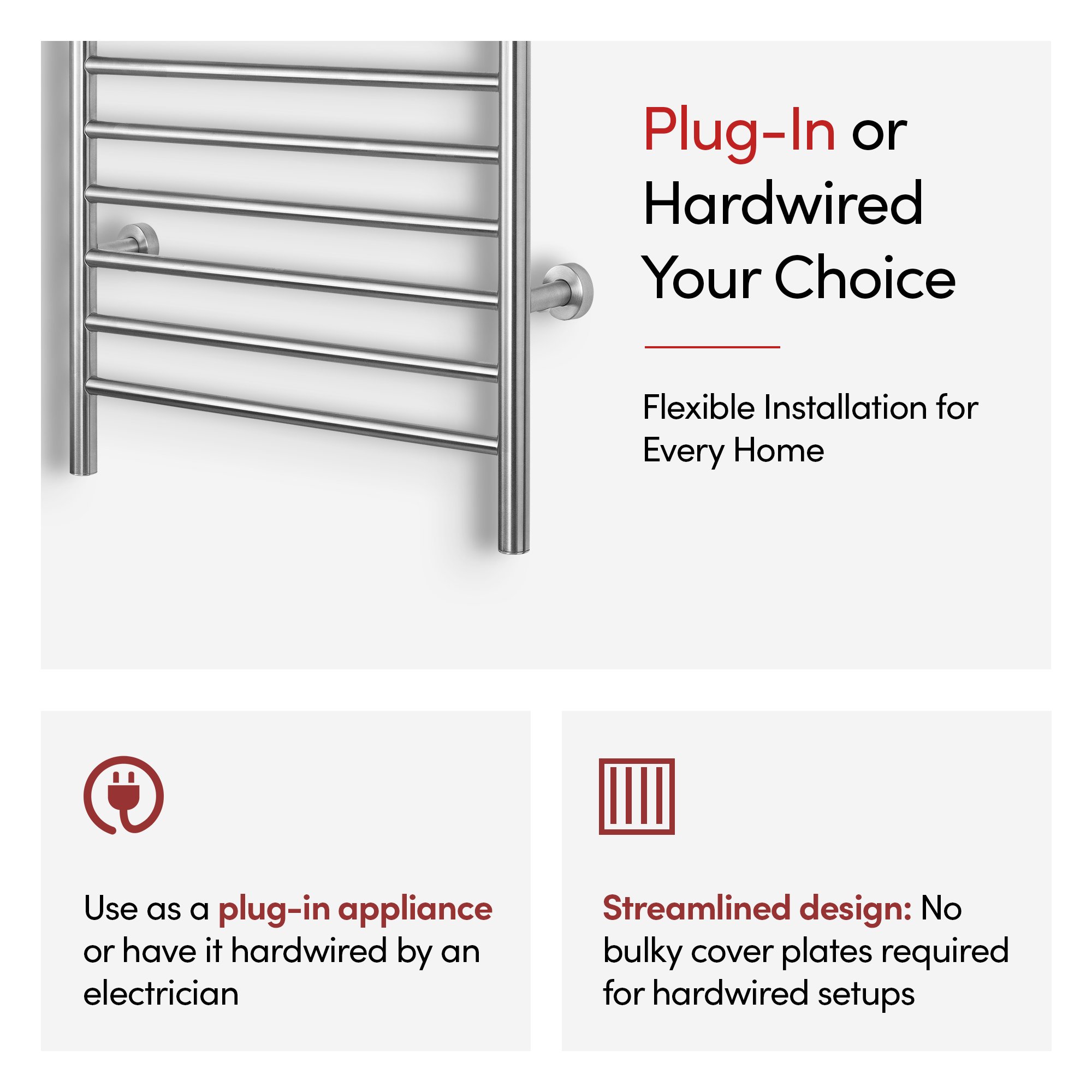 This towel warmer is also dual connection, meaning it can be used “as is” to plug into a standard 120 VAC outlet or it can be modified by a licensed electrician to have a hardwired 120 VAC electrical connection. And when this towel warmer is installed with a hardwired electrical connection, its unique design means there is no unattractive and cumbersome cover plate required. Additionally, this towel warmer is extremely safe and is cETLus listed. The Infinity comes with an LED power switch and TempSmart™ overheat protection to prevent the unit’s surface temperature from exceeding 167°F (75°C). The Infinity is covered by our 2-year manufacturer’s warranty for peace of mind.