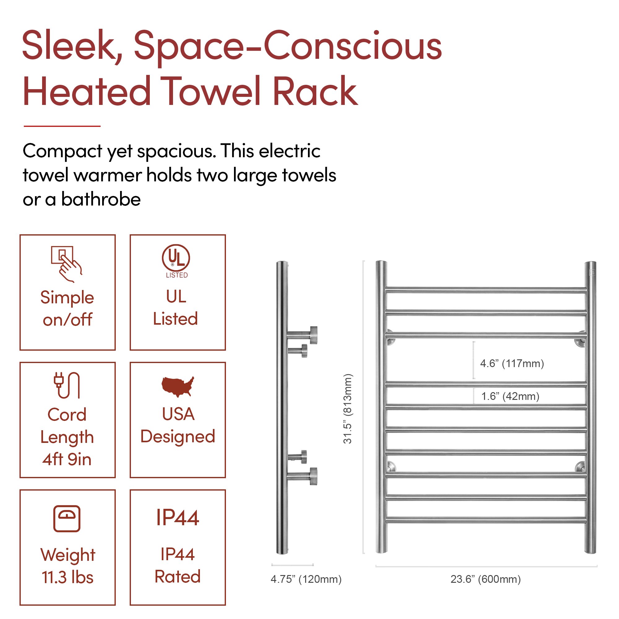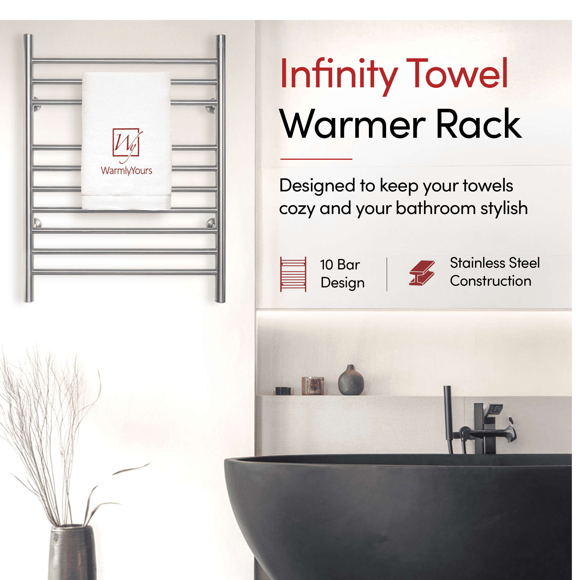 Generous 10-bar Design: The Infinity towel warmer uses 10 brushed stainless steel bars to evenly distribute heat, warming up to 2 large towels or bathrobes