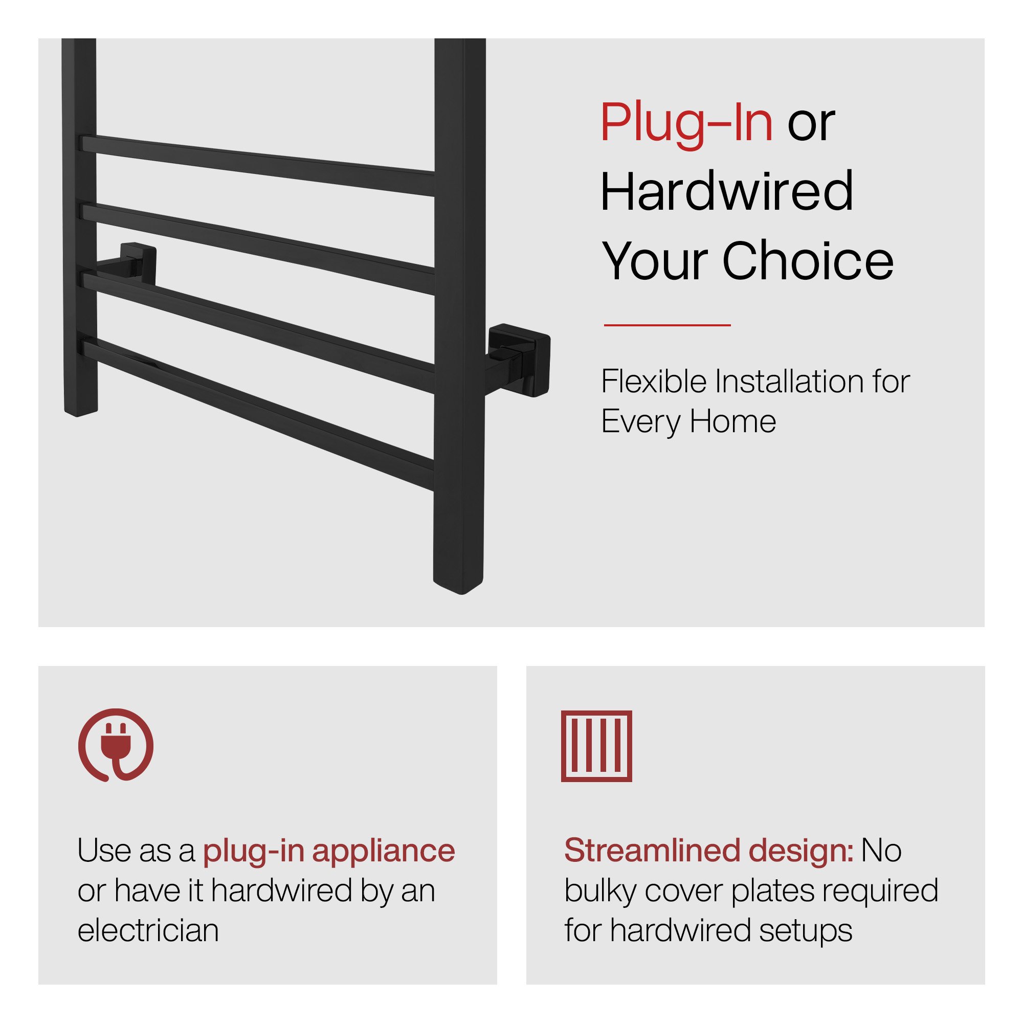 This towel warmer is also dual connection which means that it can be used “as is” to plug into a standard 120 VAC outlet or it can be modified by a licensed electrician to have a hardwired 120 VAC electrical connection. When this towel warmer is installed with a hardwired electrical connection, there is no unattractive and cumbersome cover plate required because of its unique design. The Sierra is safe and is cETLus listed. It comes with an LED power switch and TempSmart™ overheat protection to prevent the unit’s surface temperature from exceeding 167°F (75°C). For peace of mind, the Sierra is covered by our 2-year manufacturer’s warranty.