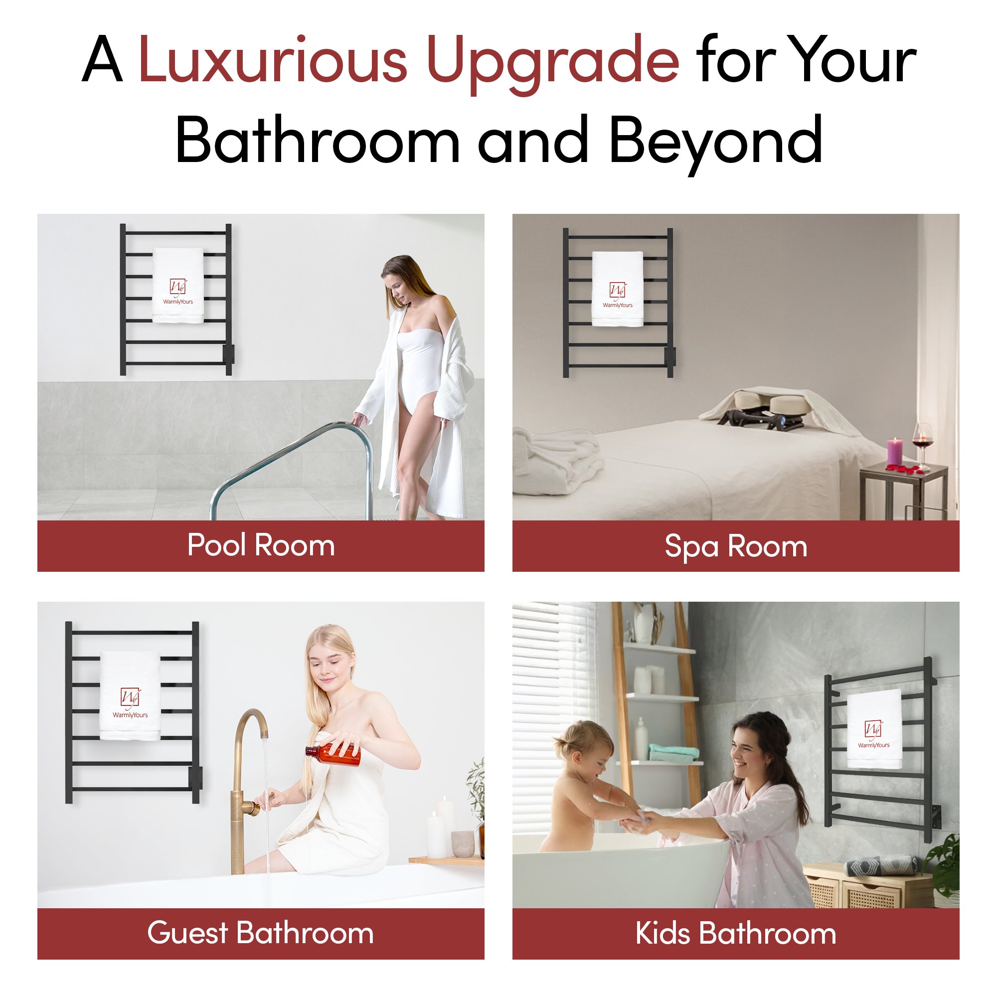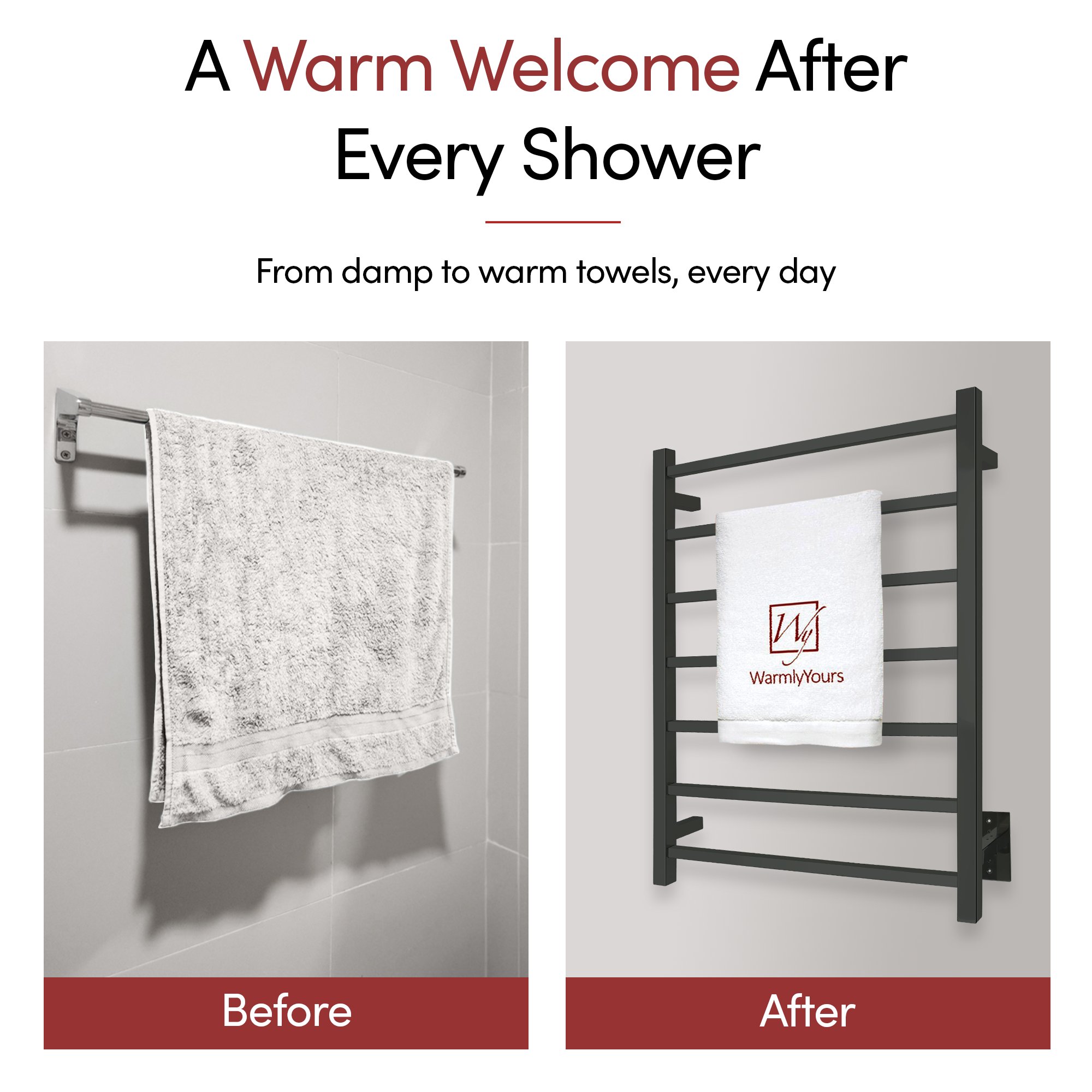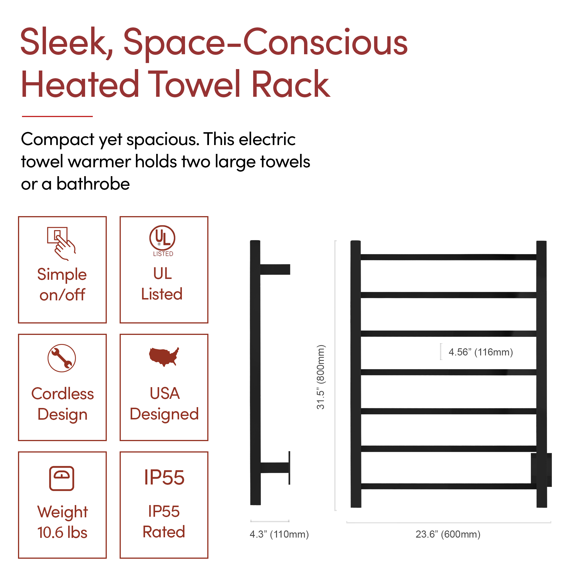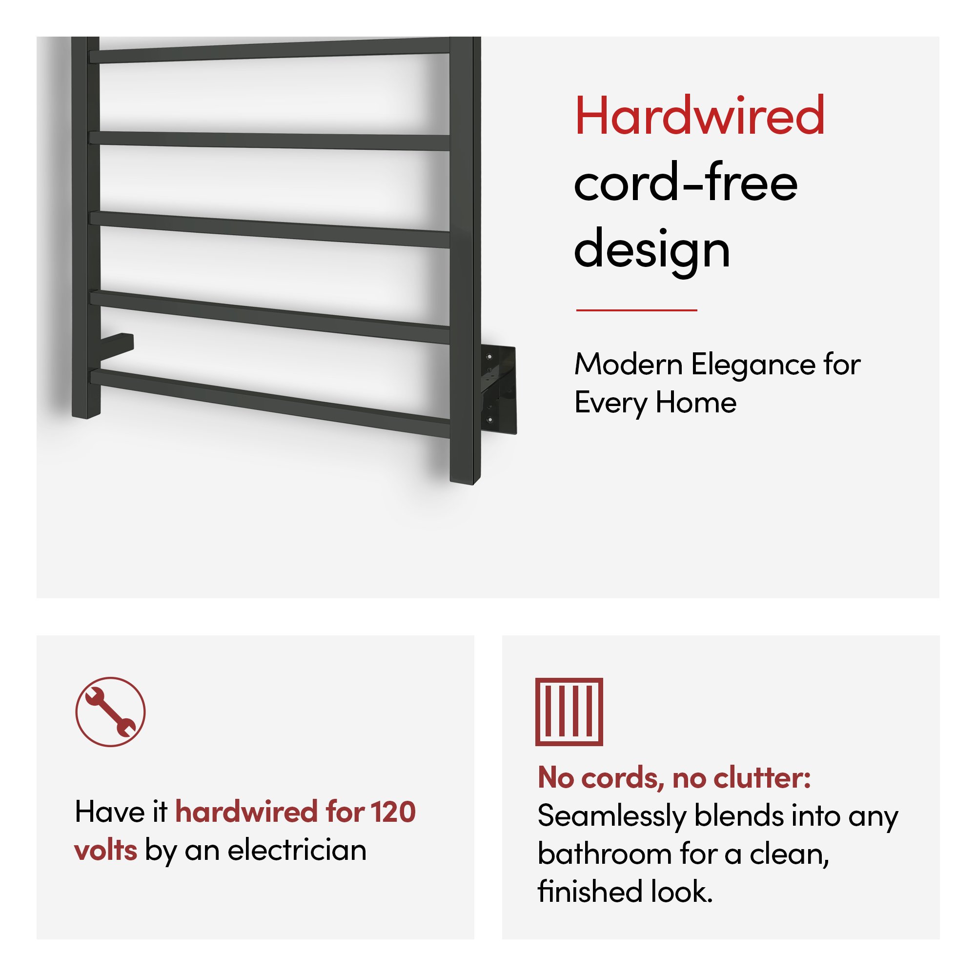 • Generous 7-Bar Design: The Tahoe 7 towel warmer uses 7 matte black stainless steel bars to evenly distribute heat, warming up to 2 large towels or bathrobes