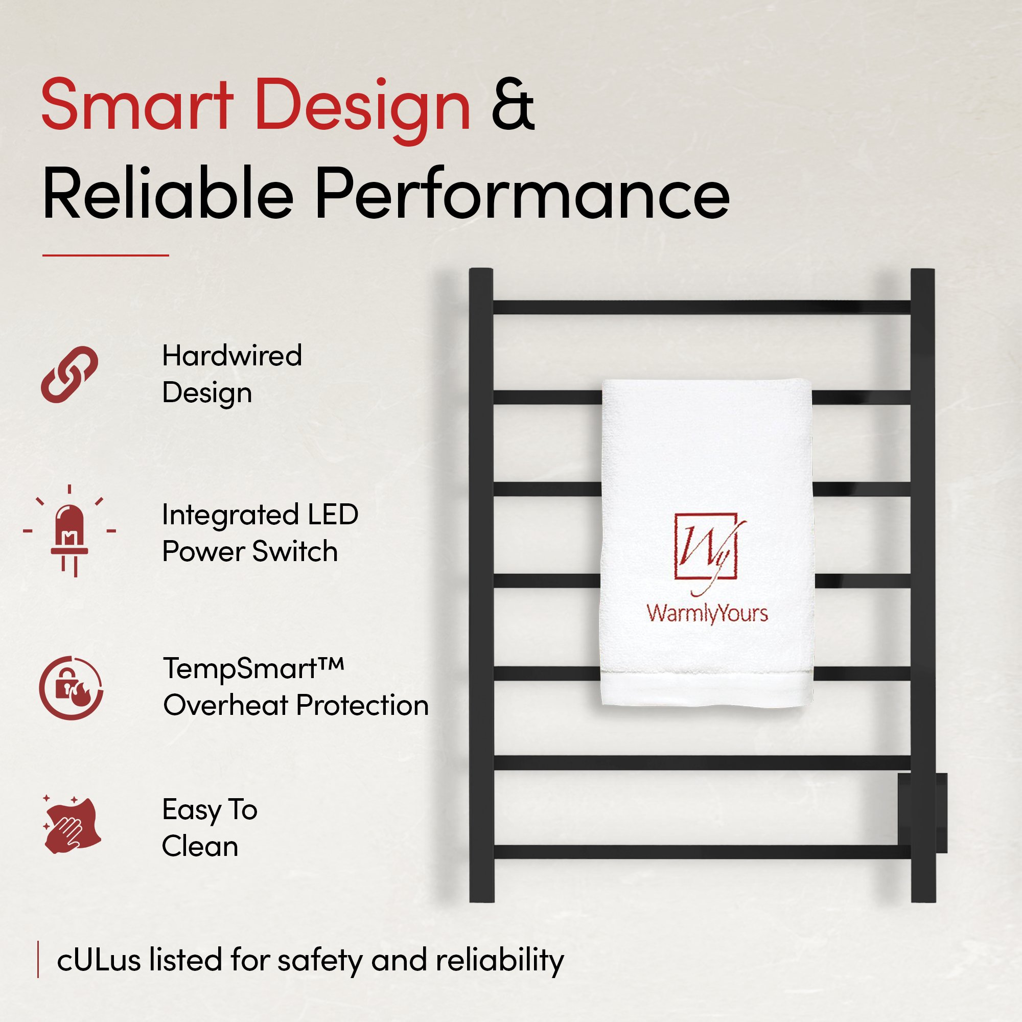 The Tahoe 7 towel warmer from WarmlyYours is the perfect balance of functionality and stunning design. This model’s discrete power switch and hardwired electrical connection (110 – 120 VAC) provides a streamlined, wall-mounted installation. The square bars and straight lines of the Tahoe 7 are a natural complement to any linear design. The 7 evenly spaced bars provide an impressive heat output of 256 BTUs per hour which will ensure that your towels and bathrobes are warm and dry. The matte black finish of the Tahoe 7 provides a visually striking element to nearly any room. This model comes with built-in TempSmart™ protection to prevent the unit’s surface temperature from exceeding 149°F (65°C).