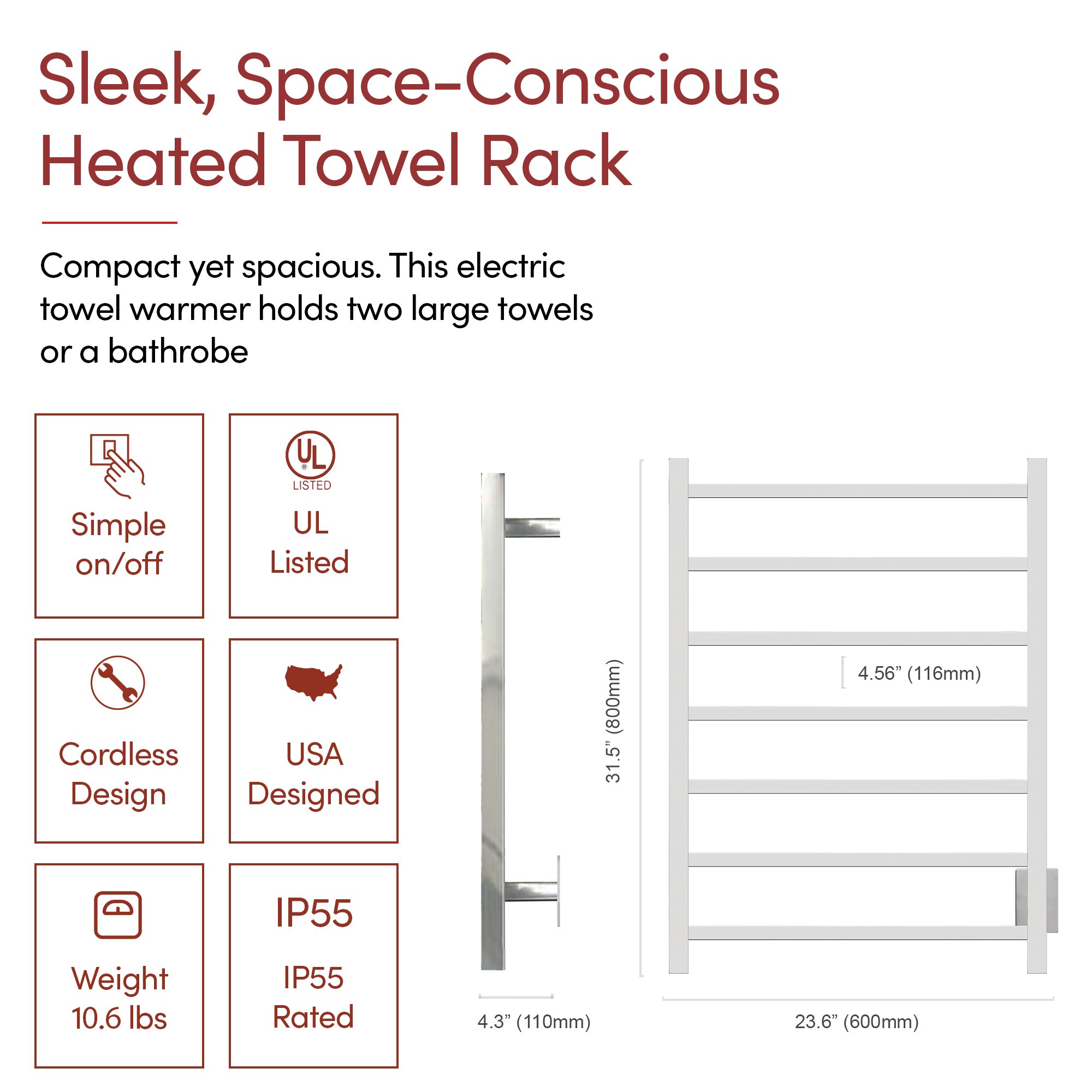 Generous 7-Bar Design: The Tahoe 7 towel warmer uses 7 polished stainless steel bars to evenly distribute heat, warming up to 2 large towels or bathrobes