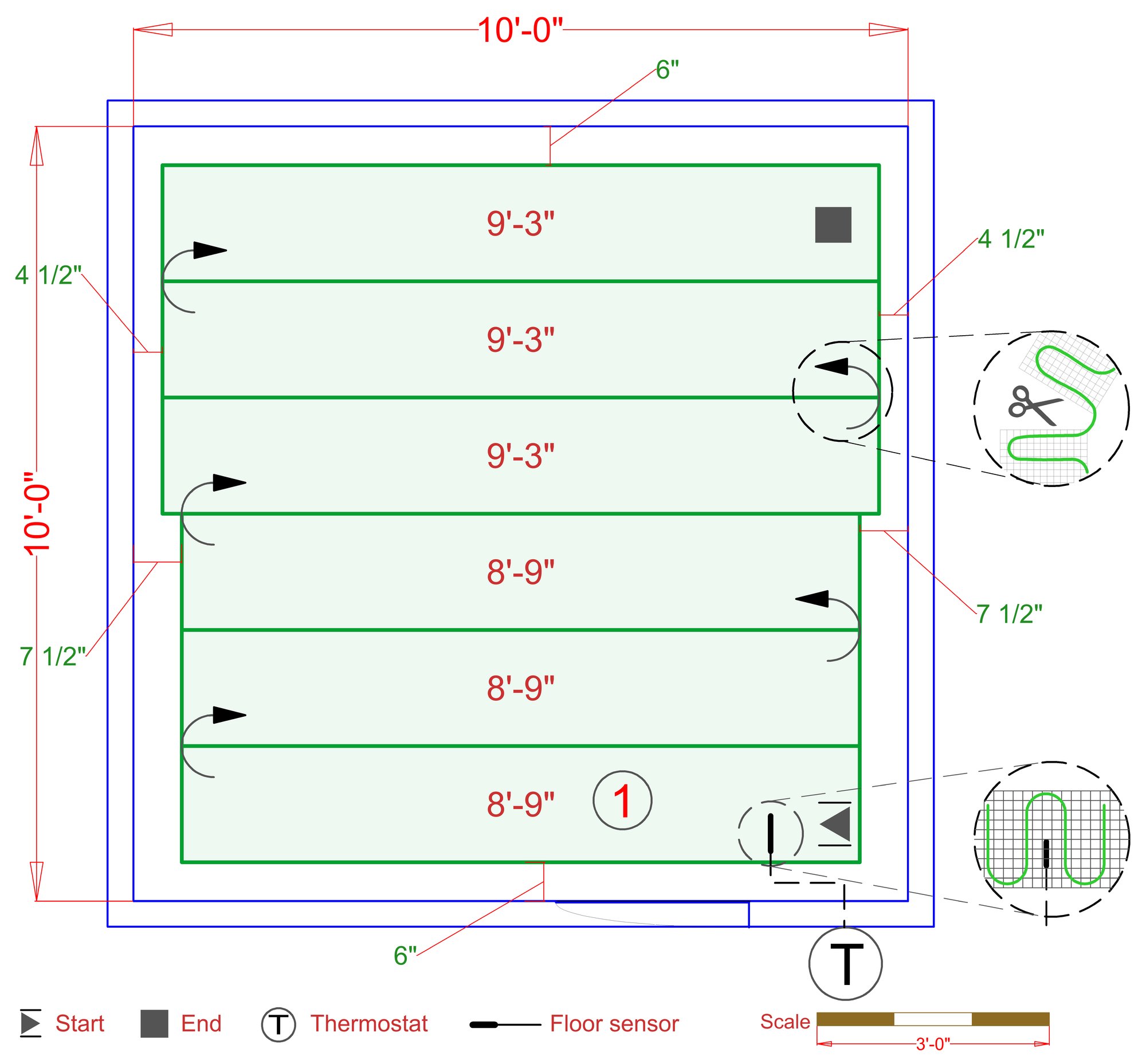 - TempZone™ Flex Rolls: Our most popular floor warming product. These rolls feature the heating cable pre-attached to a mesh fabric, allowing for fast and simple installation. They are perfect for square or rectangular rooms like this bedroom.