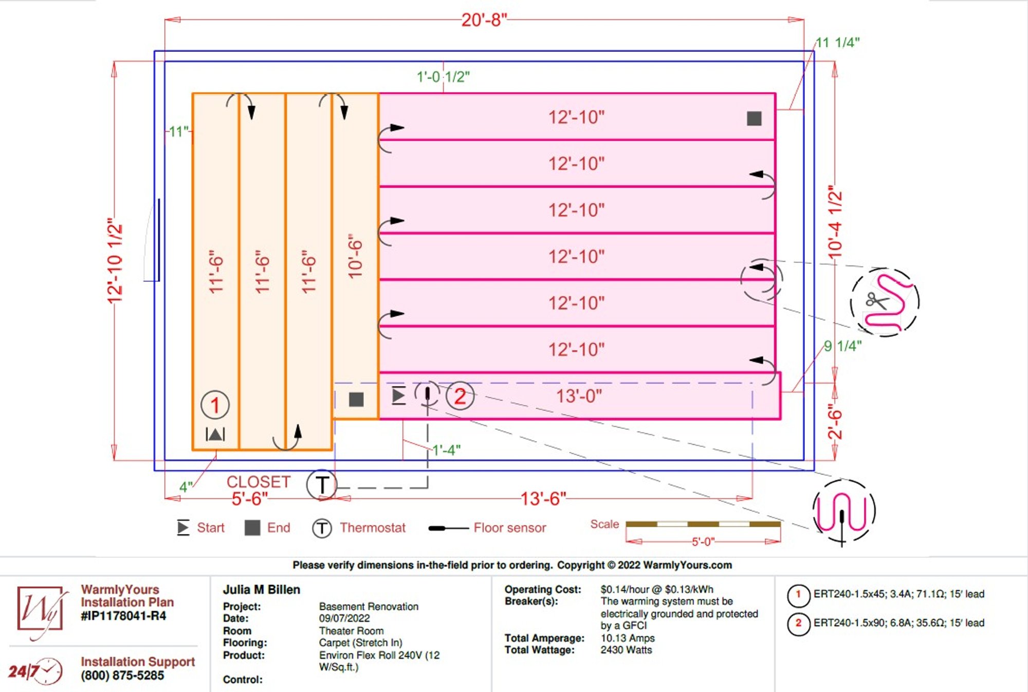 Installation Note: To achieve a professional, flush finish, the installation team carved small channels into the carpet padding to house the power supply cables. This simple step prevented any unsightly lumps in the carpet. Additionally, by keeping the heating elements exactly one foot away from the walls, the installers were able to use a power stretcher for the carpet without risking any damage to the system.