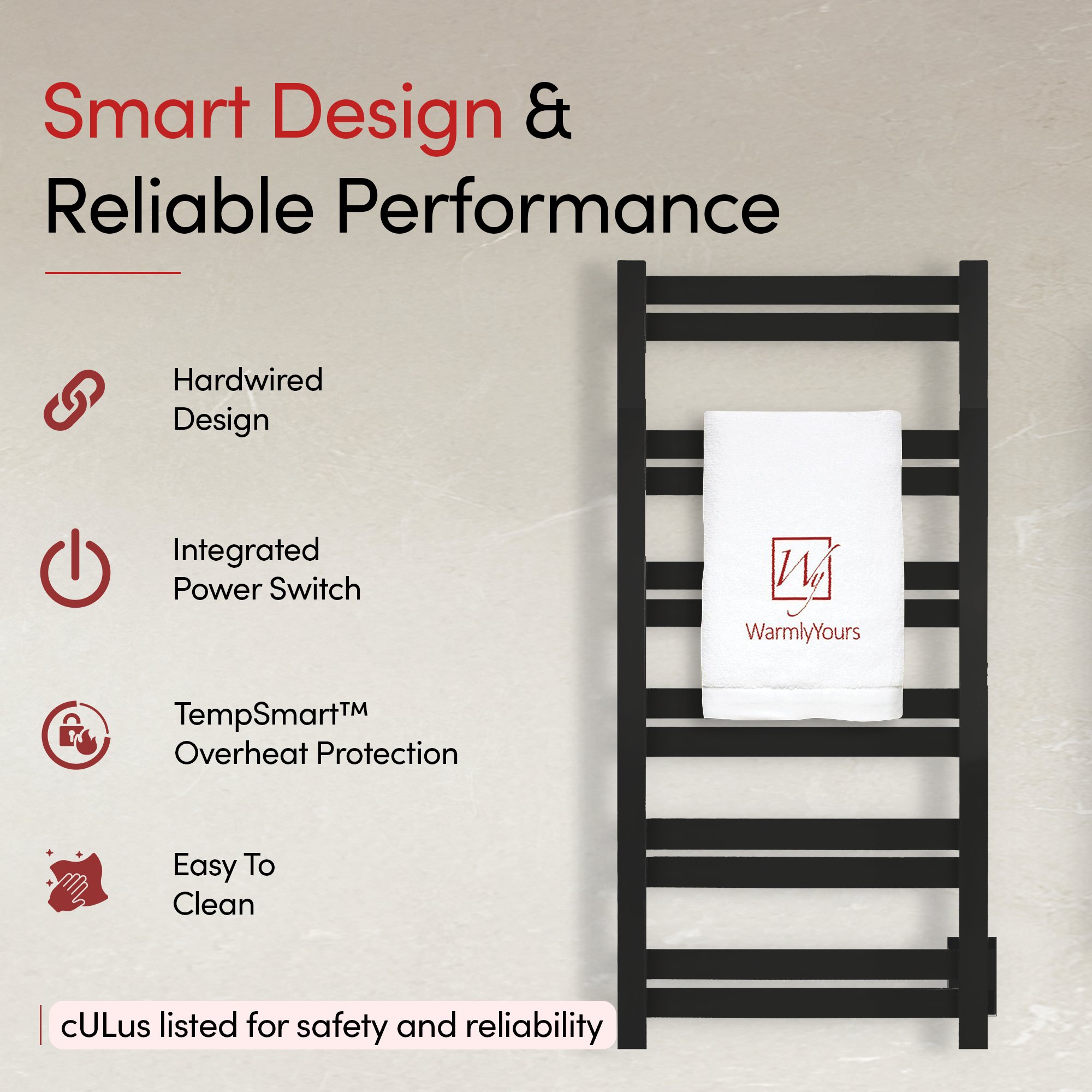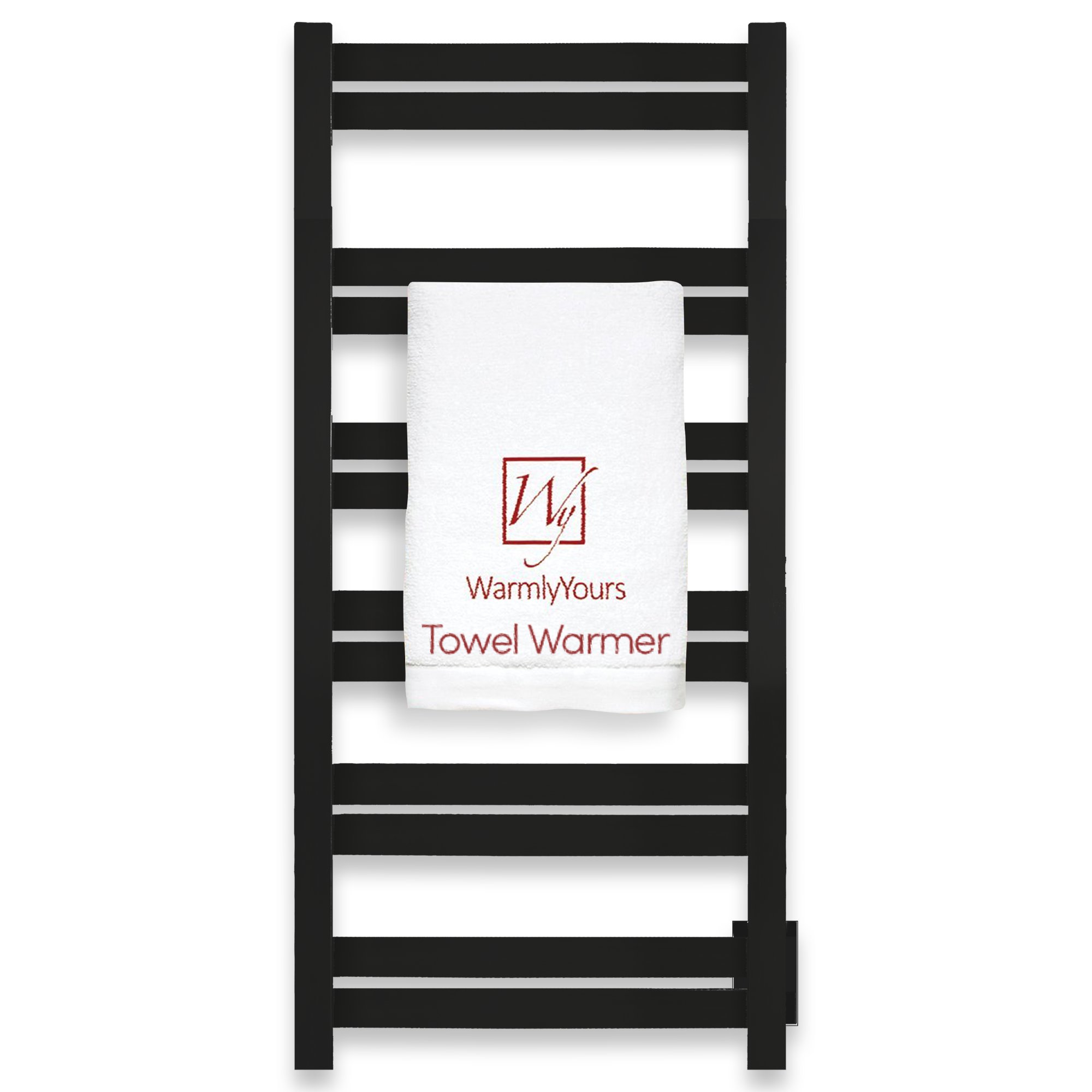 High-performance heating and stunning design aesthetics are perfectly combined in the Grande 12 towel warmer from WarmlyYours. With its 12 heated bars, the Grande 12 is one of the most powerful towel warmers for its size with a heat output of 597 BTUs per hour. The flat bars of this model create a large amount of surface area to warm and dry your towels and bathrobes. The wall-mounted Grande 12 is hardwired (110-120 VAC) which means there will not be any visible wires or plugs when its installed. The matte black finish of this model provides a visually striking element to any room. This model comes with built-in TempSmart™ overheat protection to prevent the unit’s surface temperature from exceeding 149°F (65°C).